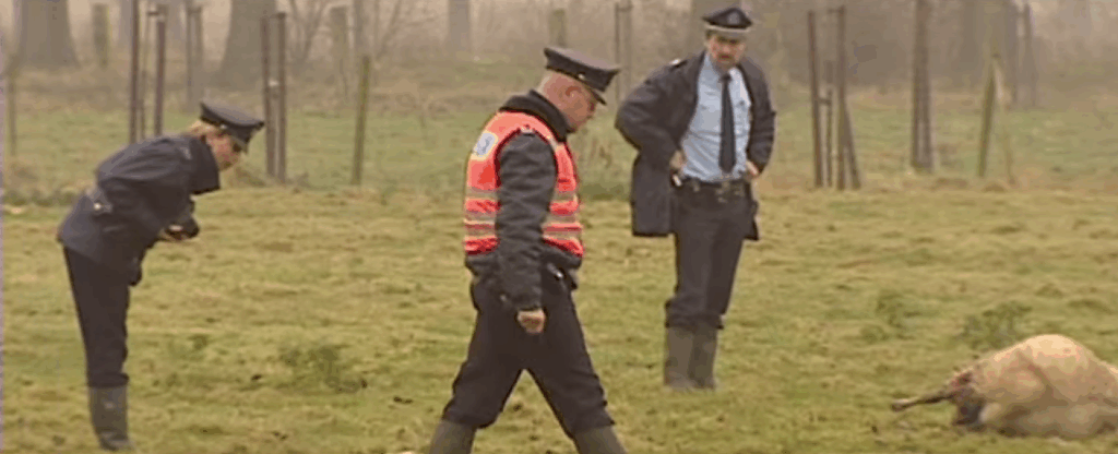 Belgian police officers inspecting what seems to be a sheep mauled by the Waasland Wolf. Credit: screengrab from Fans of Flanders YouTube channel