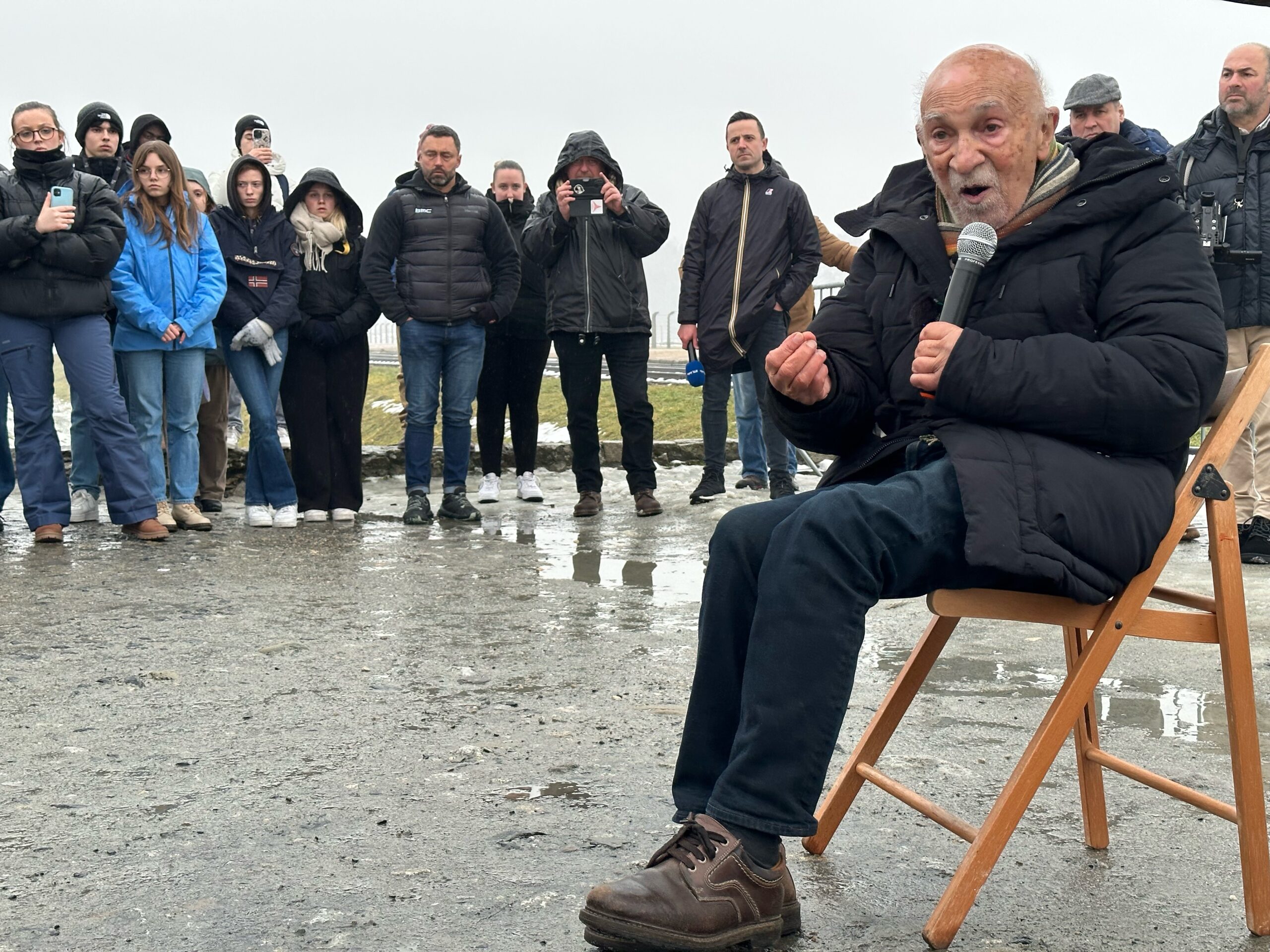 Holocaust survivor Simon Gronowski talks to a group of young Belgians during a school memorial trip. Credit: Belga/ Maarten Weynants