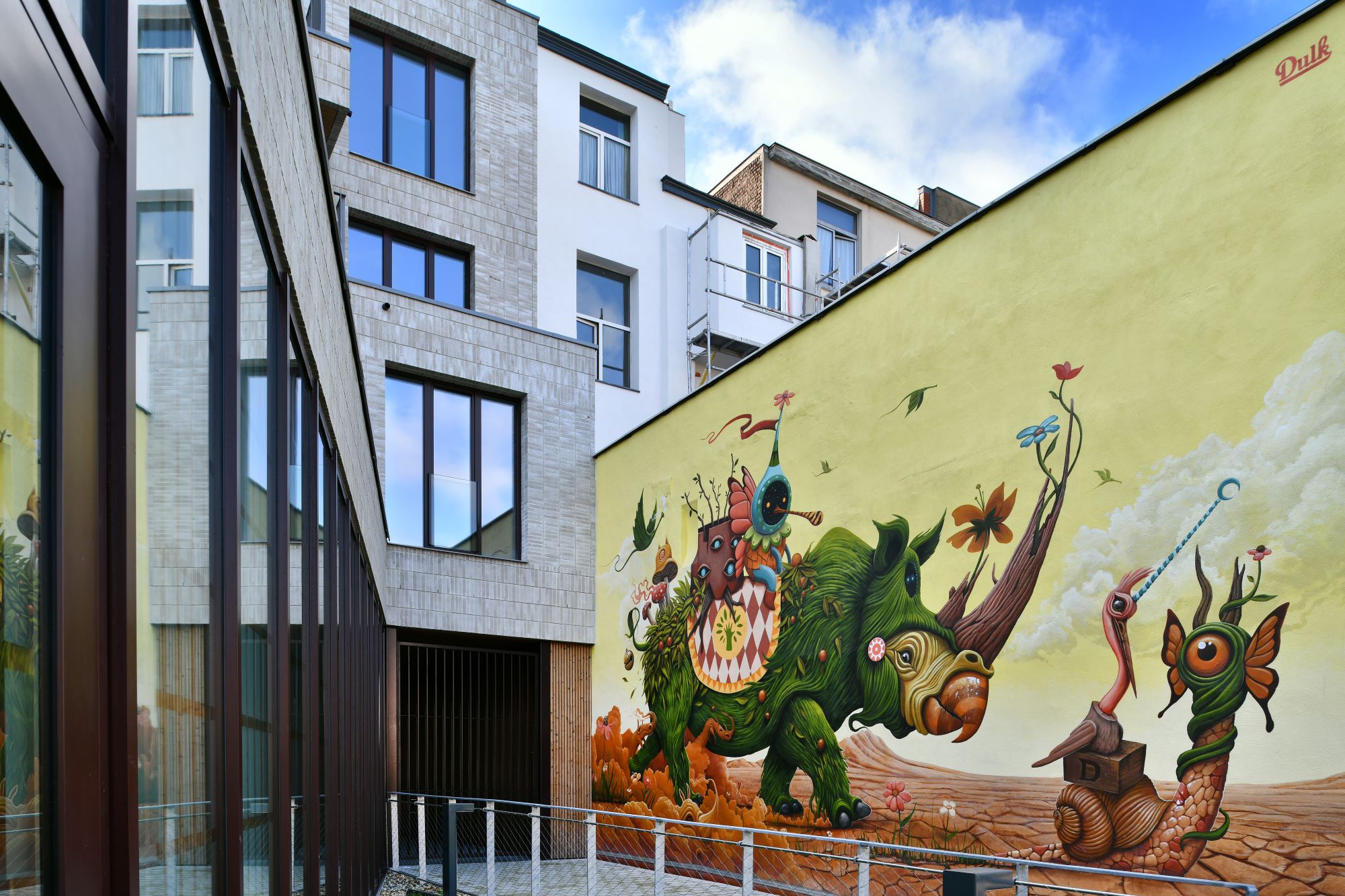 The youngsters will face out onto a mural designed by artist Dulk via the art collective All About Things. Citydev.brussels (the public body leading the renovation) has commissioned urban artists for residential projects since 2021.
