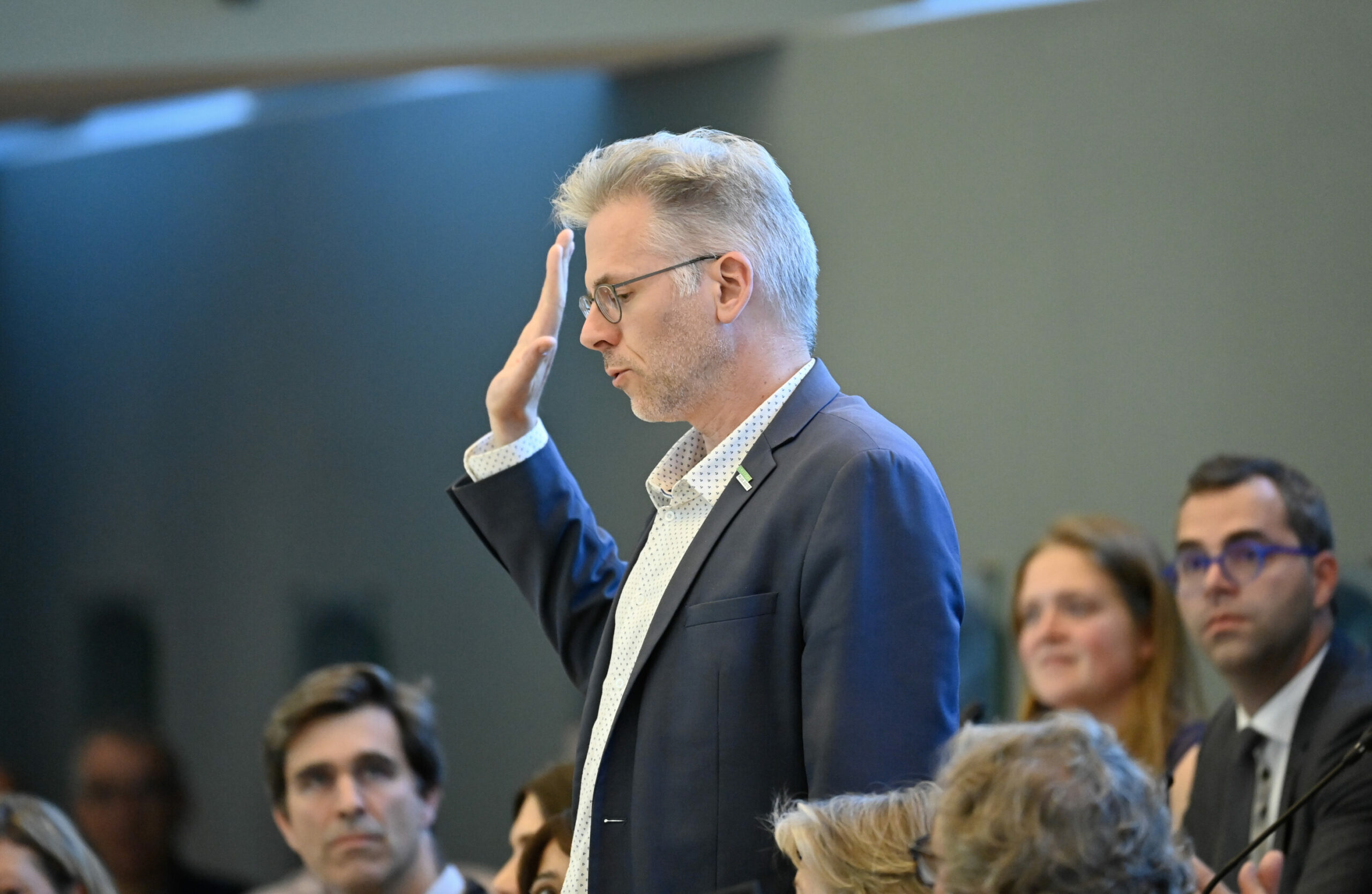 Ecolo's Stephane Hazee takes the oath at the first plenary session of the Walloon parliament in Namur, after the elections of June 9th, Tuesday 25 June 2024. Credit: Belga / John Thys