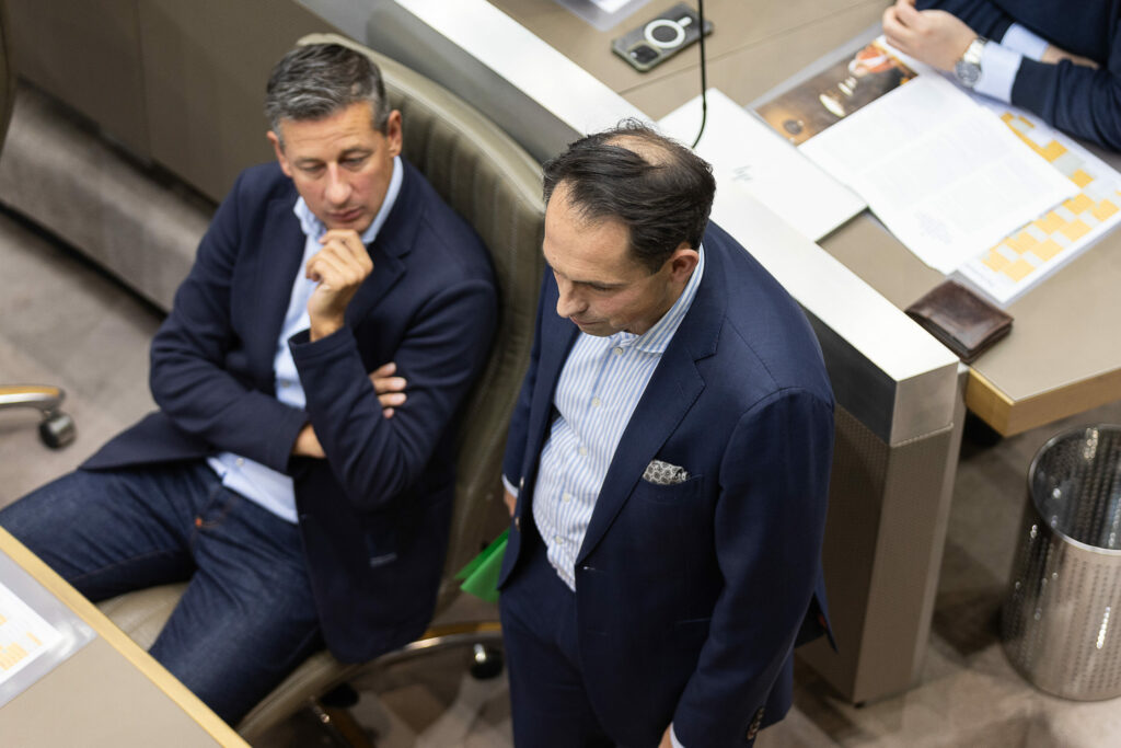 Vlaams Belang's Chris Janssens (Left) and Vlaams Belang leader Tom Van Grieken pictured during a plenary session of the Flemish Parliament. Credit: Belga / James Arthur Gekiere