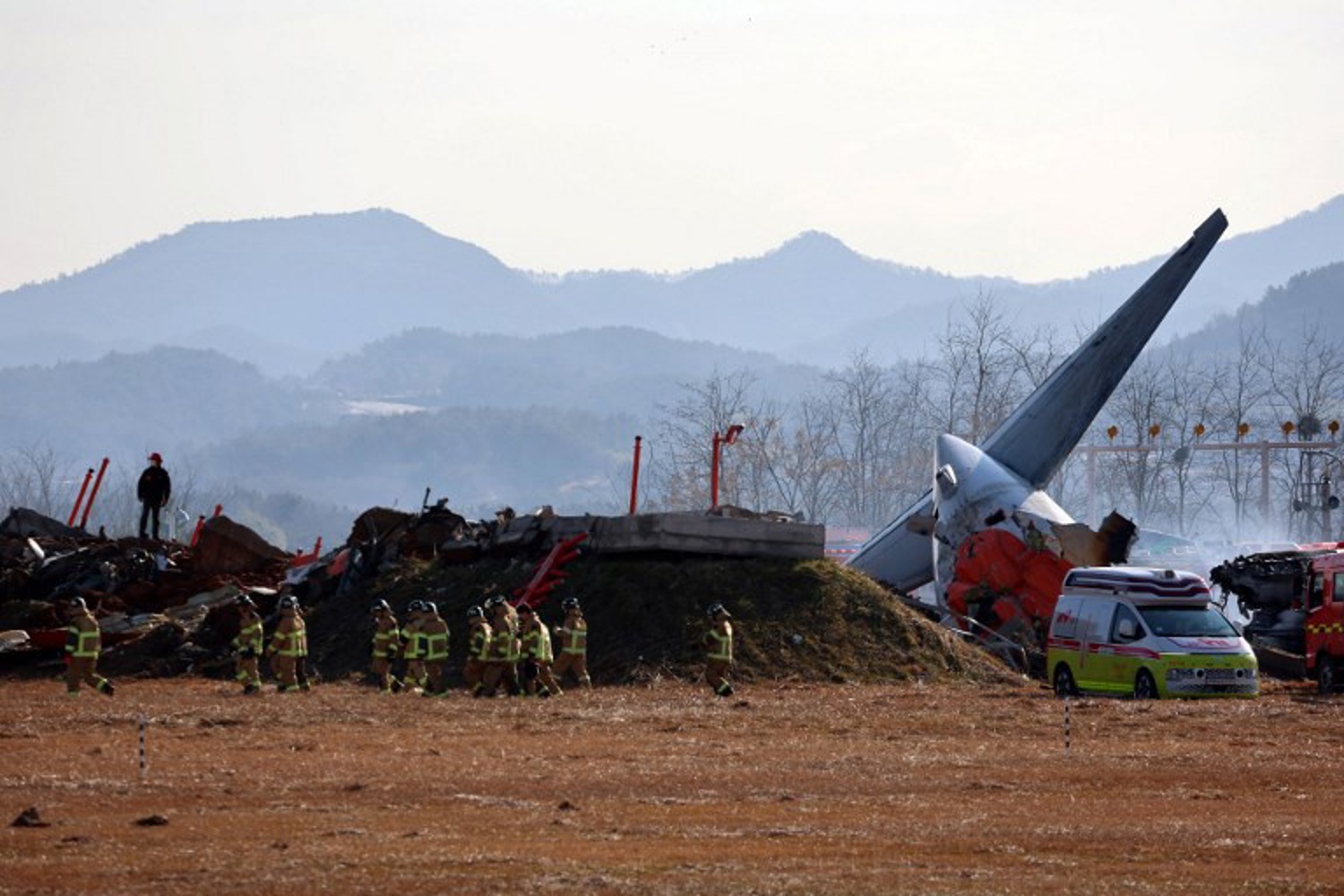 Images broadcast by South Korean television stations showed numerous emergency service vehicles and dozens of firefighters working around the charred wreckage of the plane, with the exception of the tail, and evacuating bodies wrapped in blue shrouds on stretchers.
