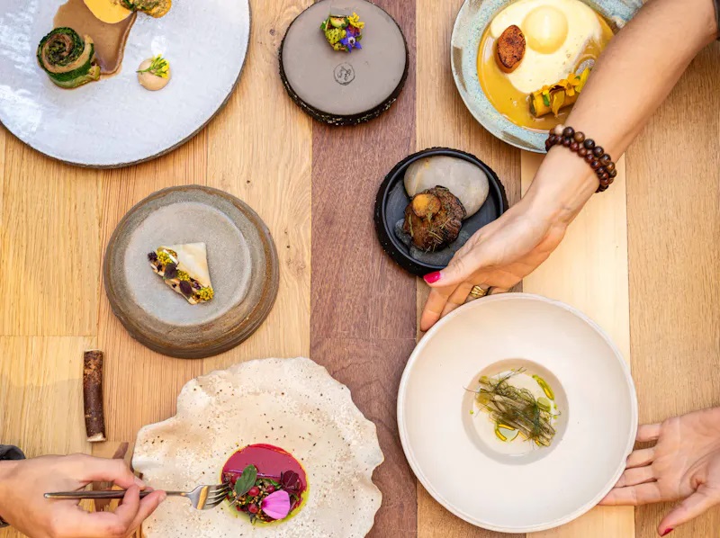 The restaurant has an astonishingly creative menu of four to seven vegetarian dishes, and each dish is named after a theme, such as naturality, resilience, passion, development and souvenir. The starters are similarly designed around the four elements of water, air, fire and earth. While one might expect the fire starter to be spicy, co-founder and chef Elliott Van de Velde instead plays with charred and charcoal aromas.