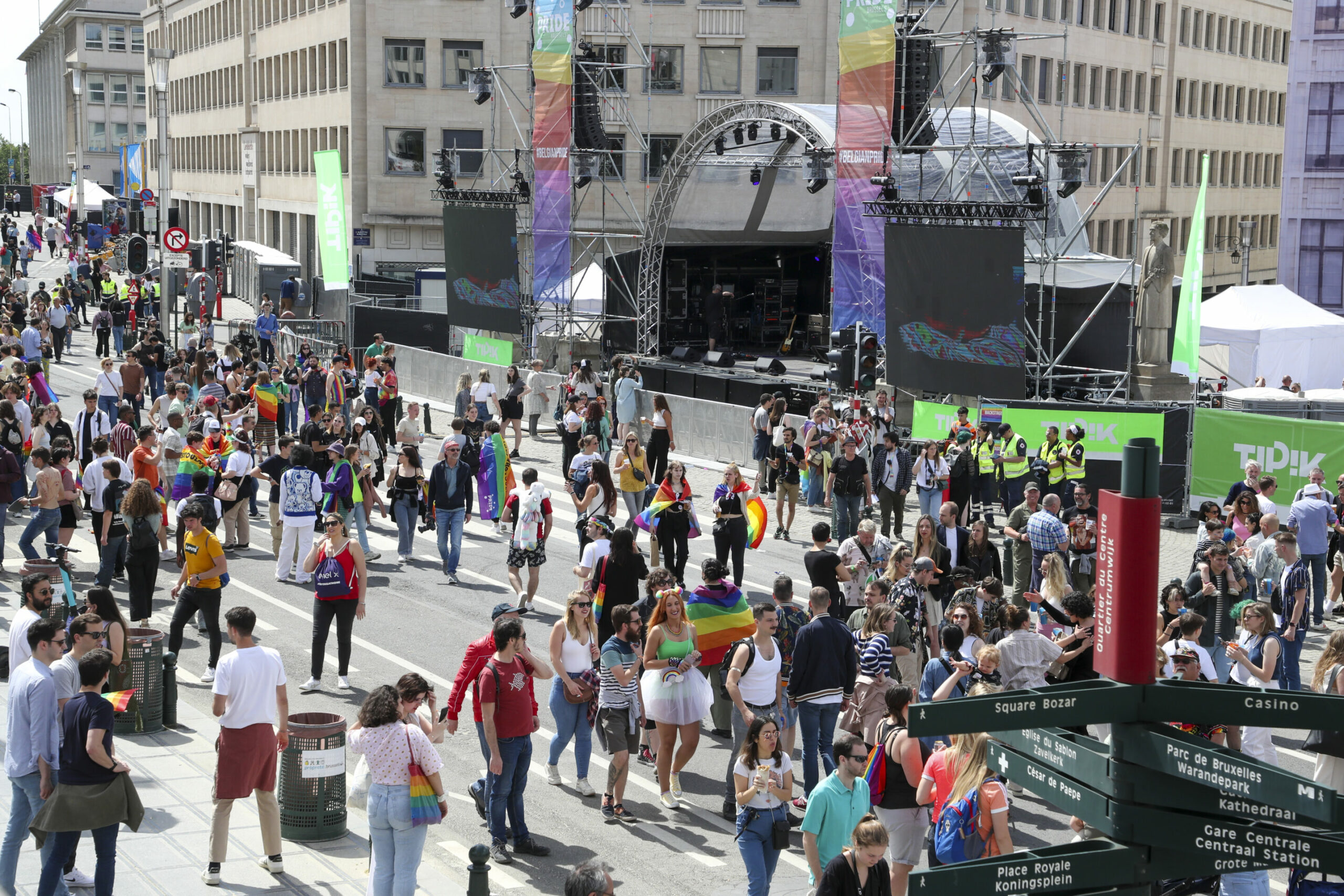 The Pride Village – an area where people learn more about LGBTQ+ organisations and associations – will open at 12:00, on Boulevard de l'Empereur, near the Mont des Arts.