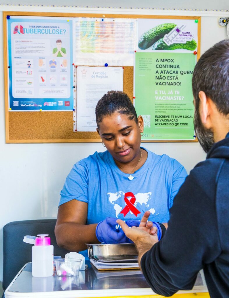 A trained lay provider administers a free rapid HIV test during an outreach event serving Portugal’s migrant community, helping to break down barriers to early diagnosis and care