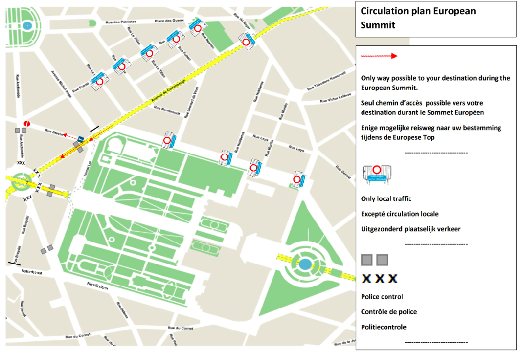 Additionally, parking will be forbidden during the summit within the security perimeter, the streets where only local traffic is allowed, on the routes taken by the delegations, on Chaussée d’Etterbeek (between Rue Belliard and Rue Van Maerlant), on Rue Van Maerlant and on Rue Belliard (between chaussée d’Etterbeek and avenue d’Auderghem)