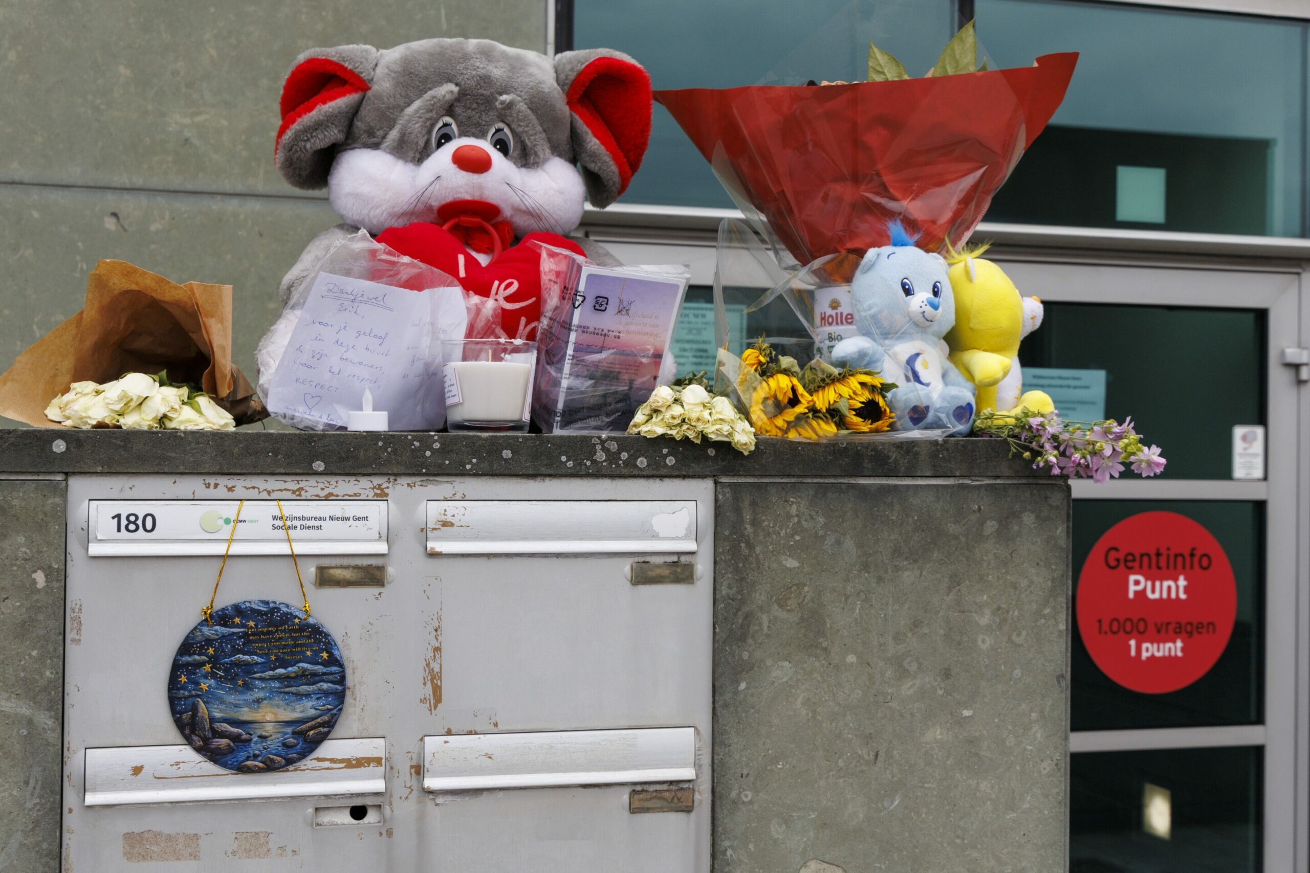 Flowers and stuffed toys at the post box of the OCMW-offices in Nieuw Gent. Credit: Nicolas Maeterlinck/Belga.