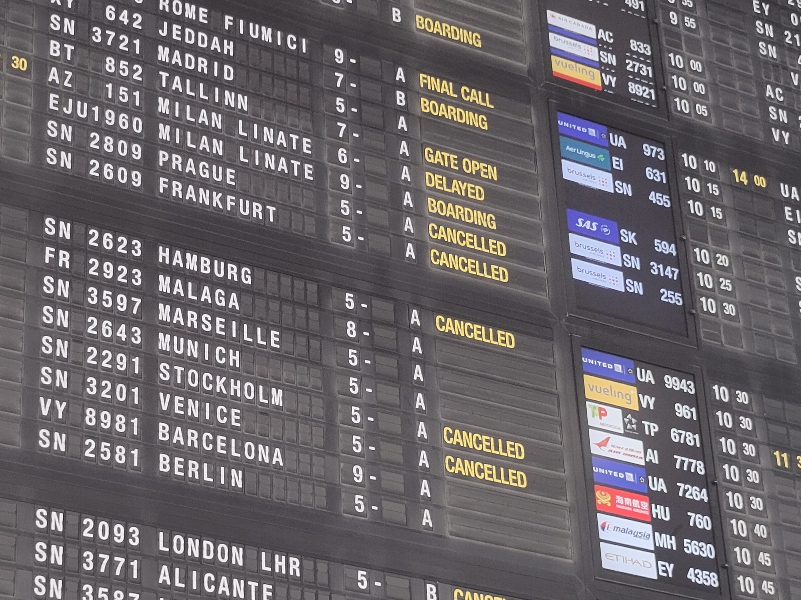 The board of the departure flights with some delayed or cancelled flights pictured at Brussels Airport on Wednesday 05 November 2025, after the drone incursions on Tuesday evening. Credit: Belga/Ine Gillis