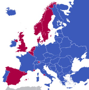 A map of Europe showing monarchies (red) and republics (blue). Credit: Wikipedia