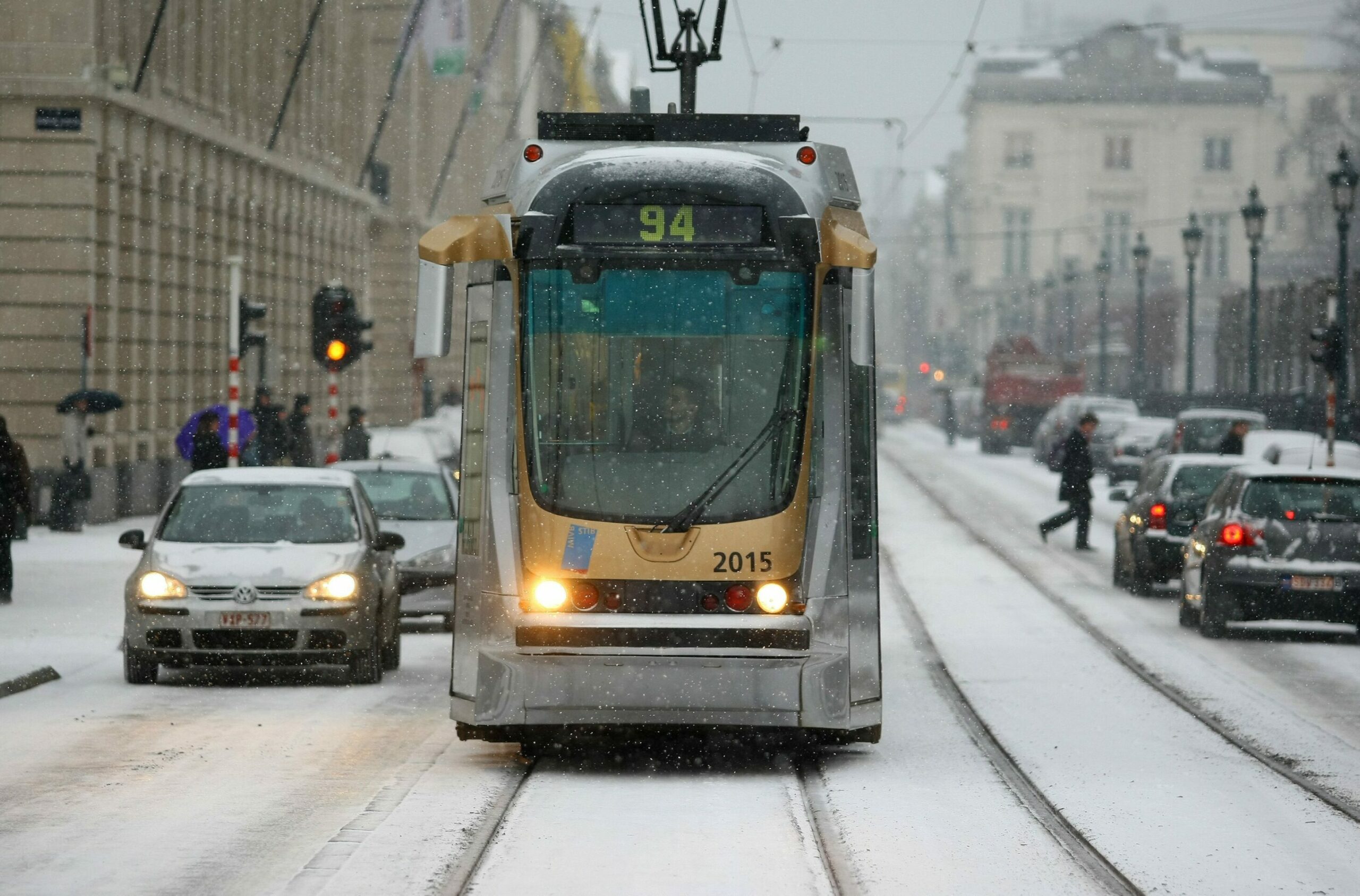Cars and a tram on a road covered with fresh snow, in Brussels city centre. Credit: Belga