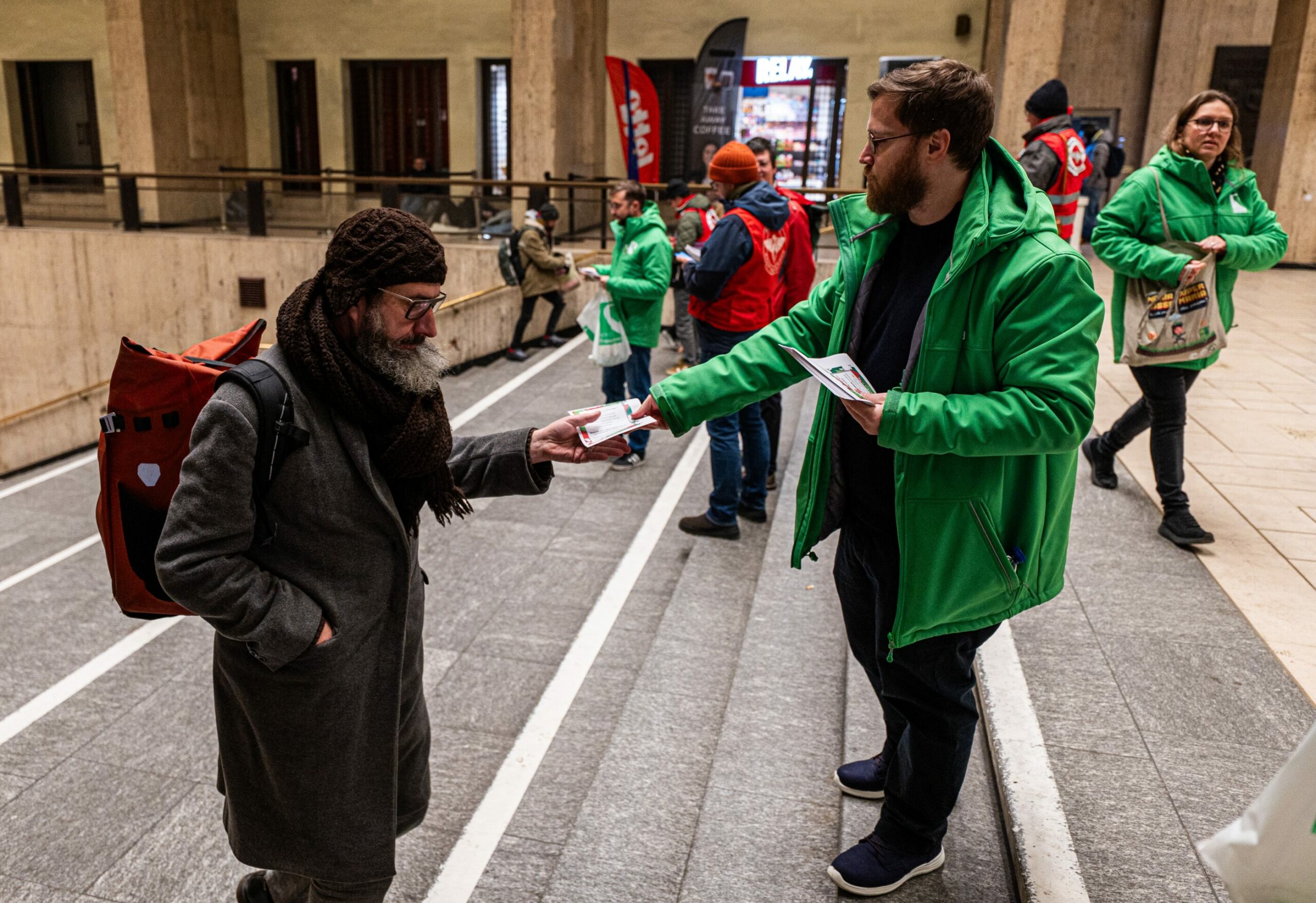 Union members distribute info flyers to commuters at the Brussels Central station, on the first day of a 5-day strike of the national railway company SNCB/NMBS on Monday, 26 January 2026. Credit: Belga/Emile Windal