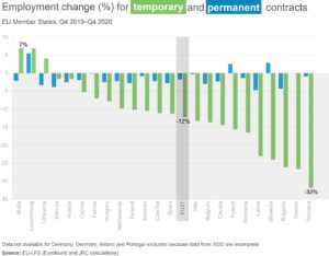 Temporary workers – particularly those in non-teleworkable jobs such as service, sales and hospitality jobs and blue-collar jobs – were disproportionately impacted by COVID-19 job loss, accounting for three-quarters of net job loss in the EU in 2020. At the same time, workers with permanent jobs in teleworkable white-collar occupational categories were largely spared from unemployment.