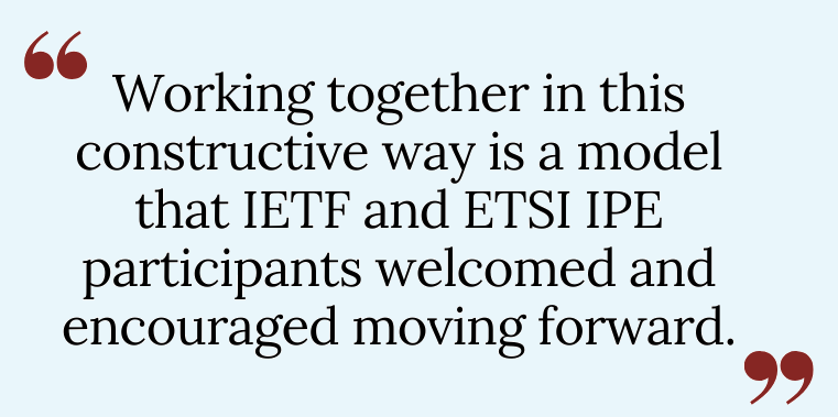 First, both parties emphasised and recognised that ETSI IPE’s work is complementing the IETF’s objectives, by collecting requirements from industry use cases with the aim of incentivising the adoption of IETF protocols.