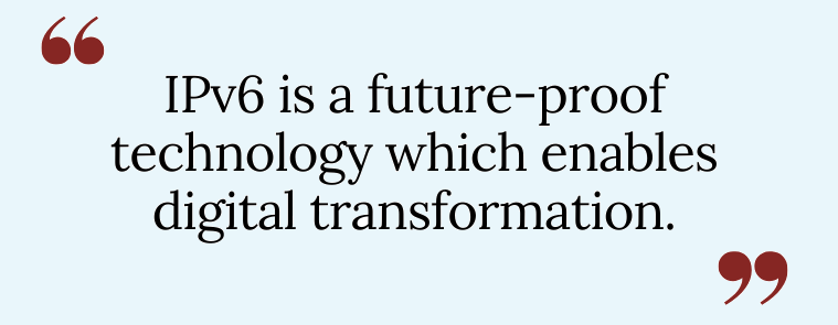 Real-world examples include the ‘unmanned industry’, smart cities, healthcare, and connected & automated vehicles. IPv6 is becoming a basic ingredient for the network to meet the performance, support the number of connected devices, and match the demand coming from services like 5G and IoT.