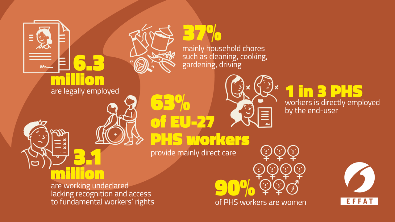 Domestic workers, defined at EU level under the term “Personal and Household Services (PHS) workers” amount to approximately 9.5 million in Europe, representing almost 5% of EU-27 total employment. Composed primarily of women, they are an integral part of the care economy. They work every day to give us the opportunity to enjoy a decent work-life balance, come home to a clean environment and meet the care for our beloved ones.