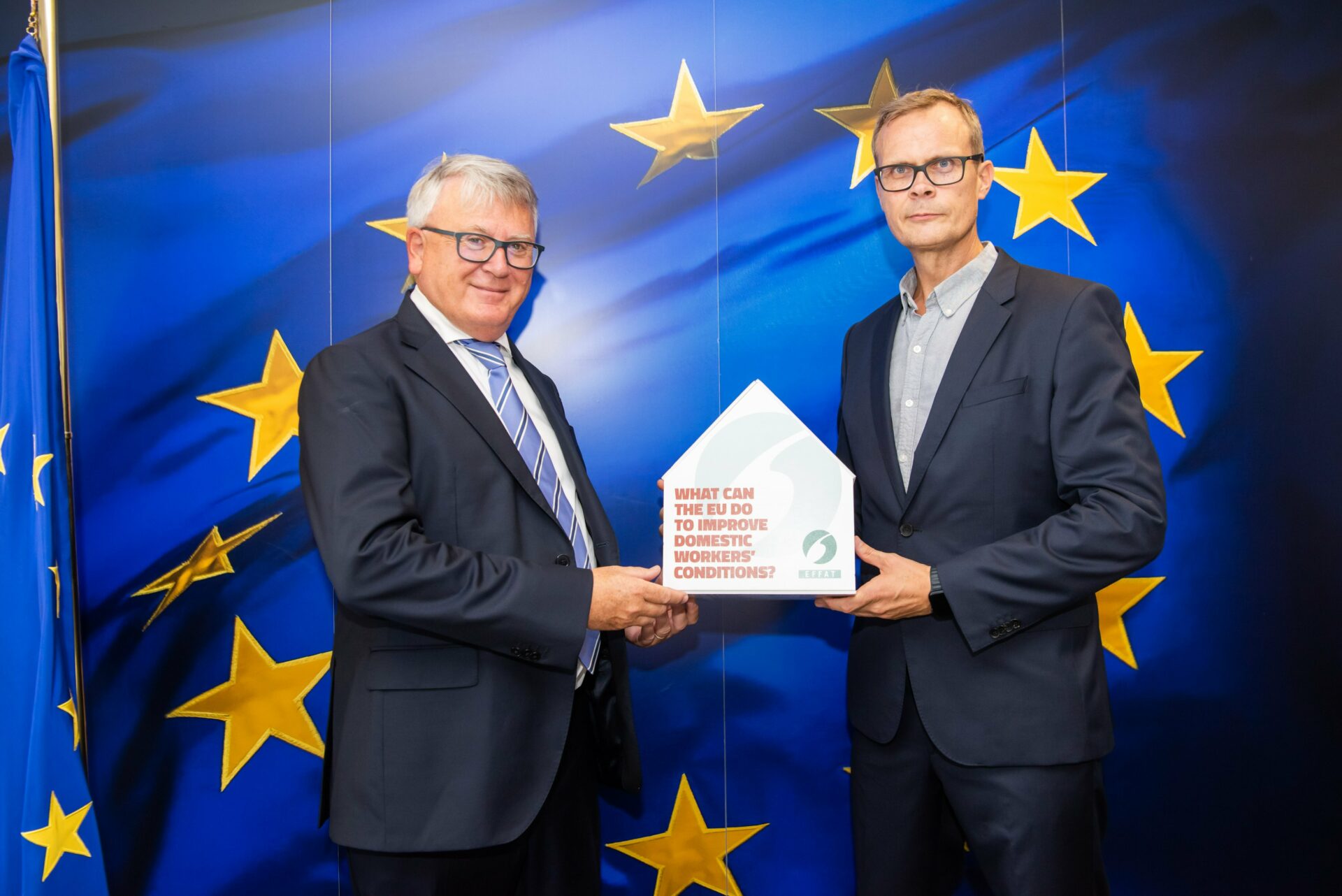 Kristjan Bragason (right), EFFAT Secretary General handing over the House of Dignity to Nicolas Schmit (left), European Commissioner for Jobs and Social Rights. Credit: European Union 2022