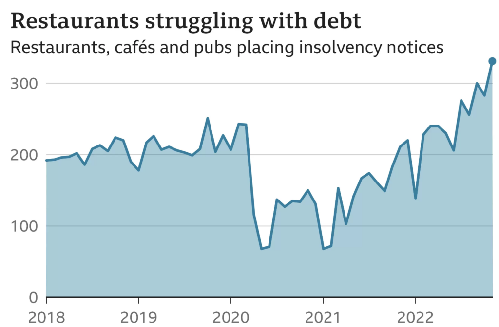 A recent analysis by the BBC found that hospitality venues such as restaurants and pubs were some of the most susceptible to struggling with debt; in November, 331 food-serving establishments had to close doors permanently as they were unable to maintain their operational costs.