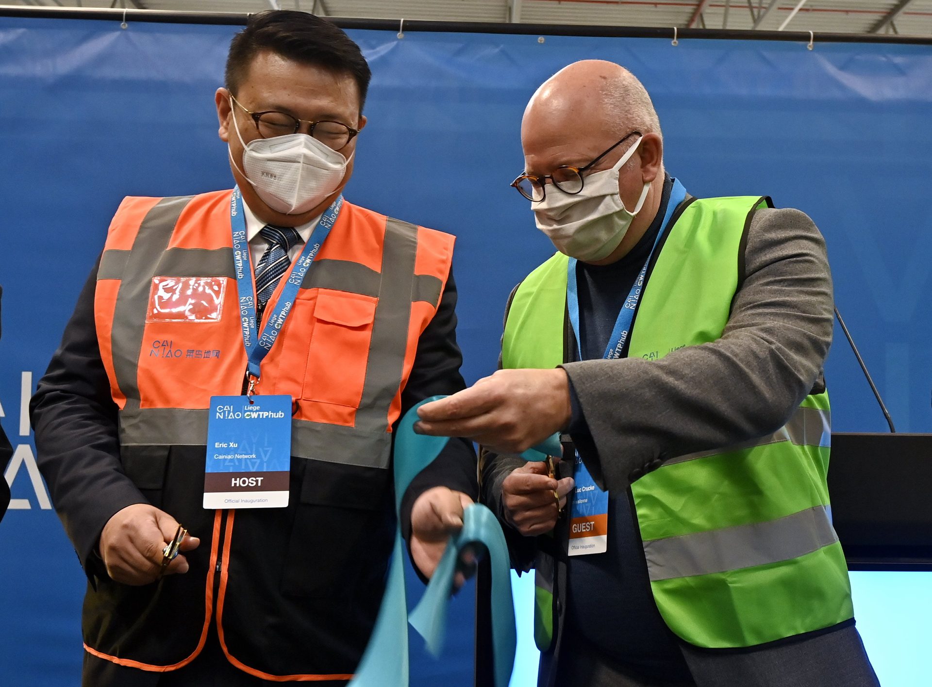 Eric Xu of Cainiao Network and Walloon Minister of Budget, Finances and Airports Jean-Luc Crucke during the inauguration of the logistics platform of Cainiao, the logistics branch of Alibaba, 8 November 2021 at Liège Airport. Credit: Belga / Eric Lalmand