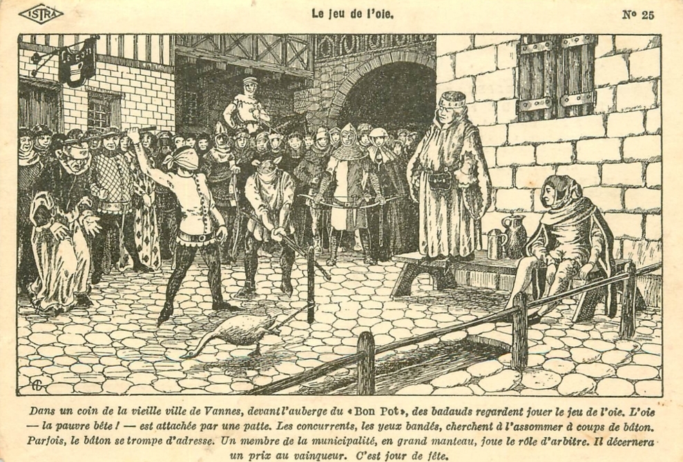 An old postcard of a Middle-Age version of goose pulling in Vannes, France. Credit: Public Domain via Wikimedia Commons