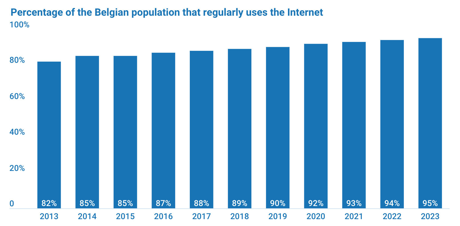 Researchers found that 95% of those surveyed in Belgium said they used the internet this year, compared to 89% in 2018 and 82% in 2013. Of the remaining 5%, 2% had not used the internet for at least three months before the survey, while 3% had never used it at all.