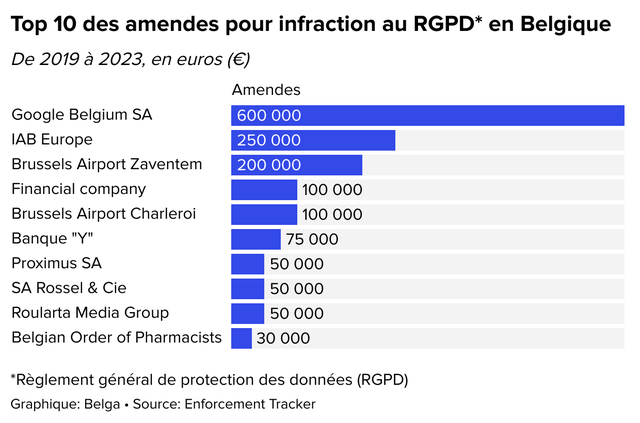 Translation: Top ten in fines for GDPR breaches in Belgium between 2019 and 2023. Credit: Belga