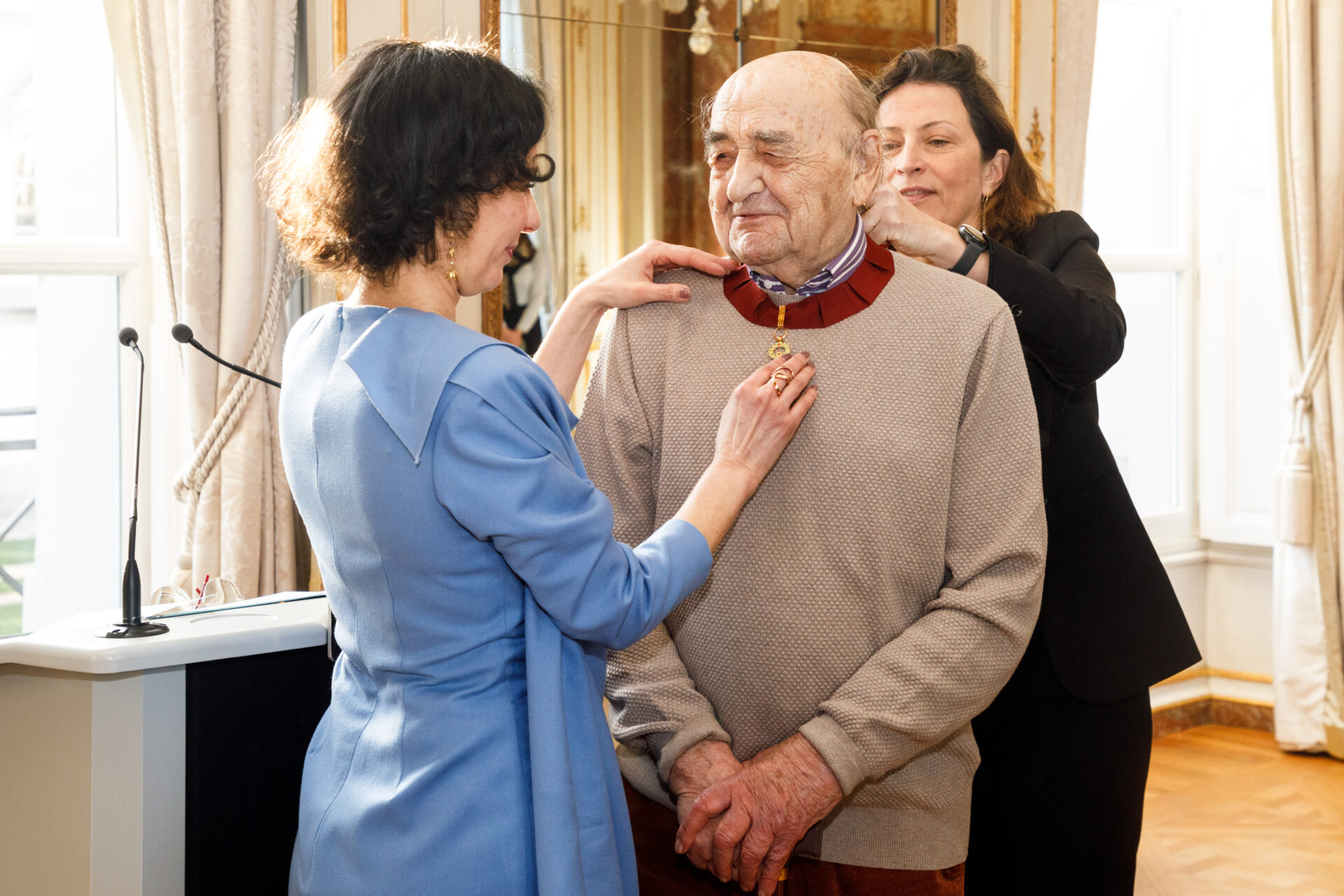 Foreign Minister Hadja Lahbib and Siegi Hirsch pictured during a ceremony to award the 'Commander in the Order of the Crown' medal to Siegi Hirsch, Holocaust survivor and European pioneer in systemic family therapy, Saturday 27 January 2024, in Brussels. Credit: Belga / Hatim Kaghat