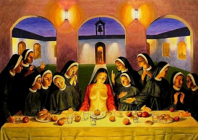 Indian artist Tom Vattakuzhy’s ‘Supper at Nunnery’ triggered backlash at the 2025 Kochi-Muziris Biennale in India, after protests from the Church, briefly closing the venue before the work was withdrawn and the exhibition reopened, credit: Freemuse/Tom Vattakuzhy, Facebook.