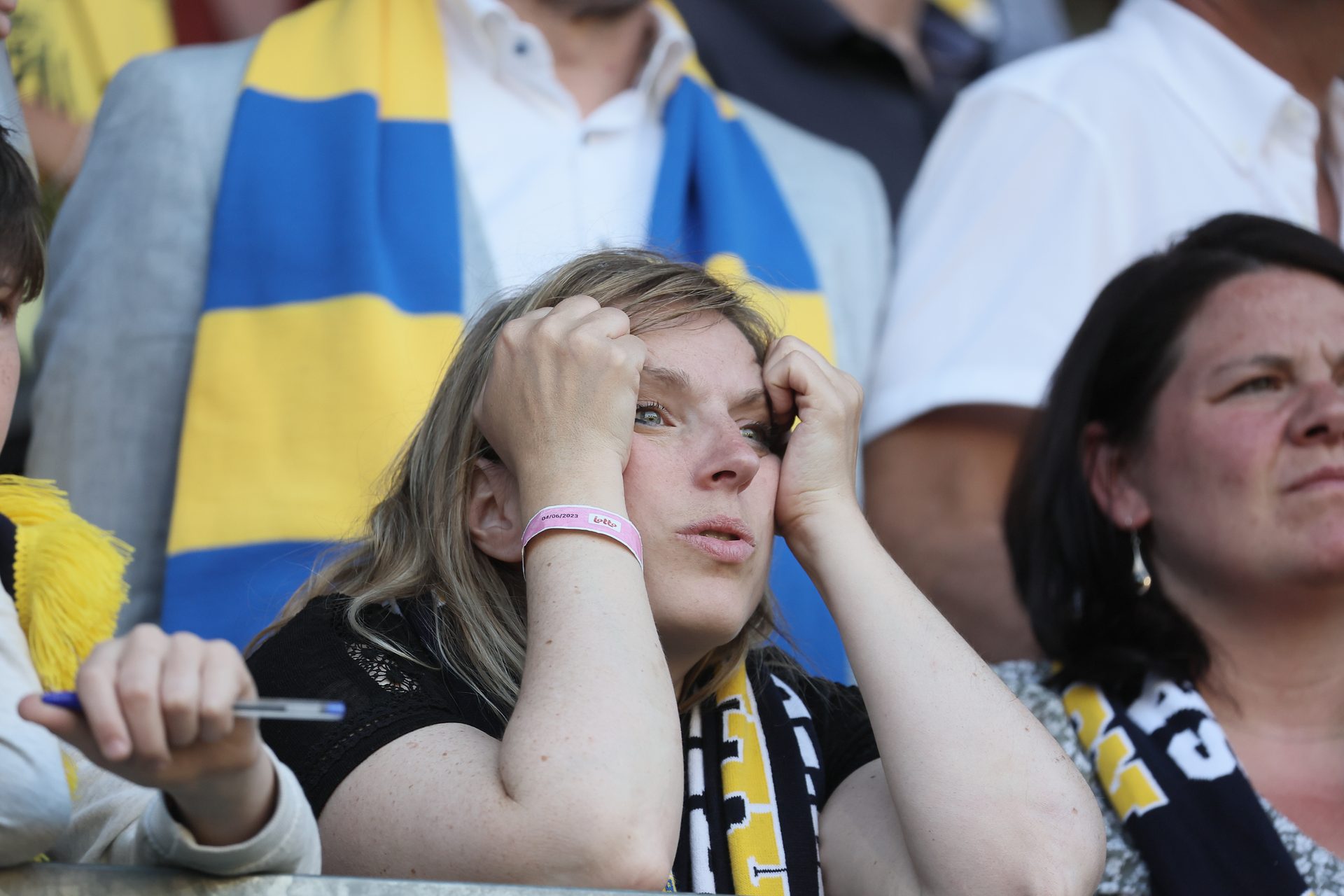 Union's supporters look dejected after losing the league in the match between Royale Union Saint-Gilloise and Club Brugge, Sunday 04 June 2023 in Brugge during the 2022-2023 'Jupiler Pro League' first division of the Belgian championship. Credit: Belga / Bruno Fahy