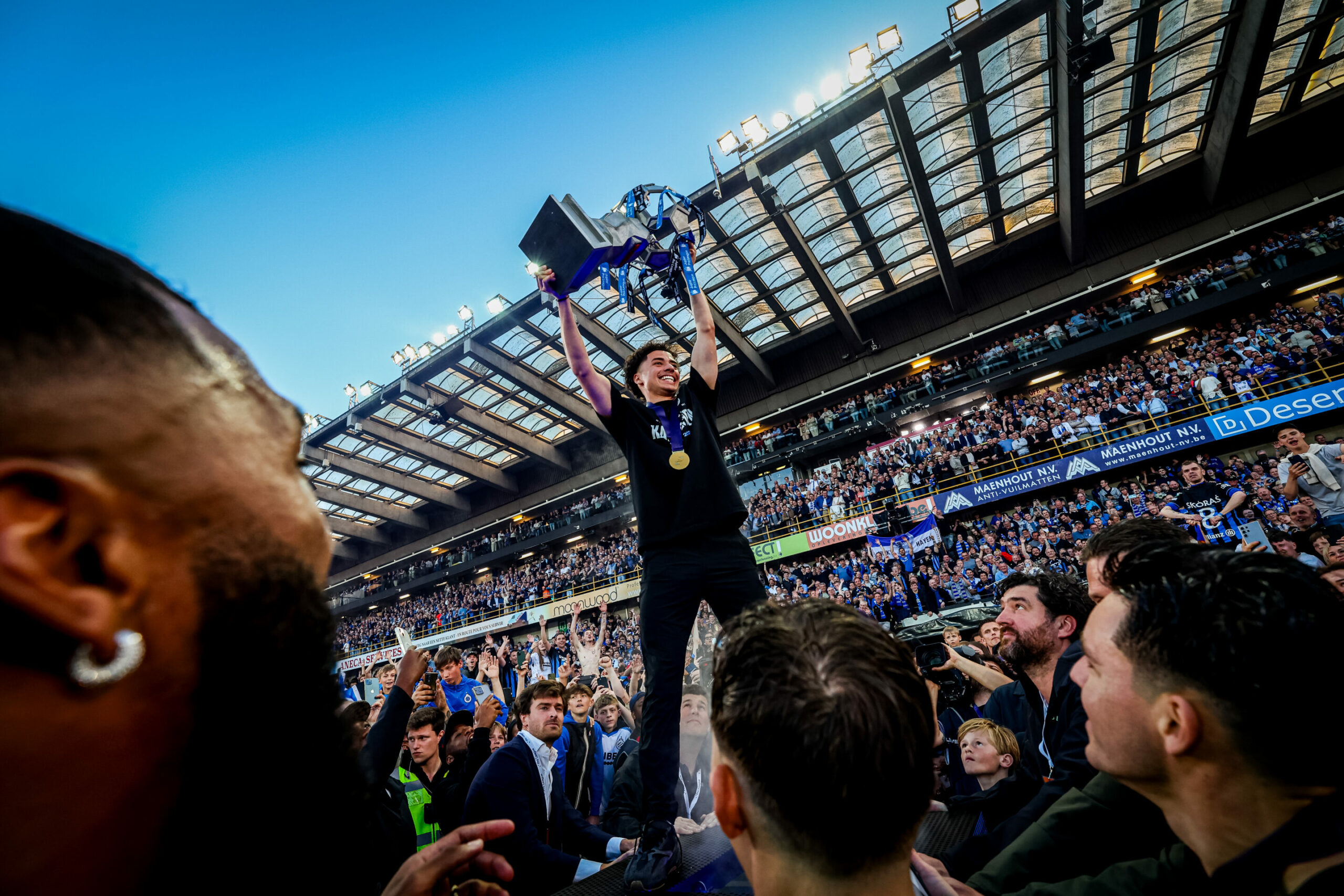 Club Brugge's Chemsdine Talbi celebrates winning the Belgian football league in 2024. Credit: Belga / Kurt Desplenter