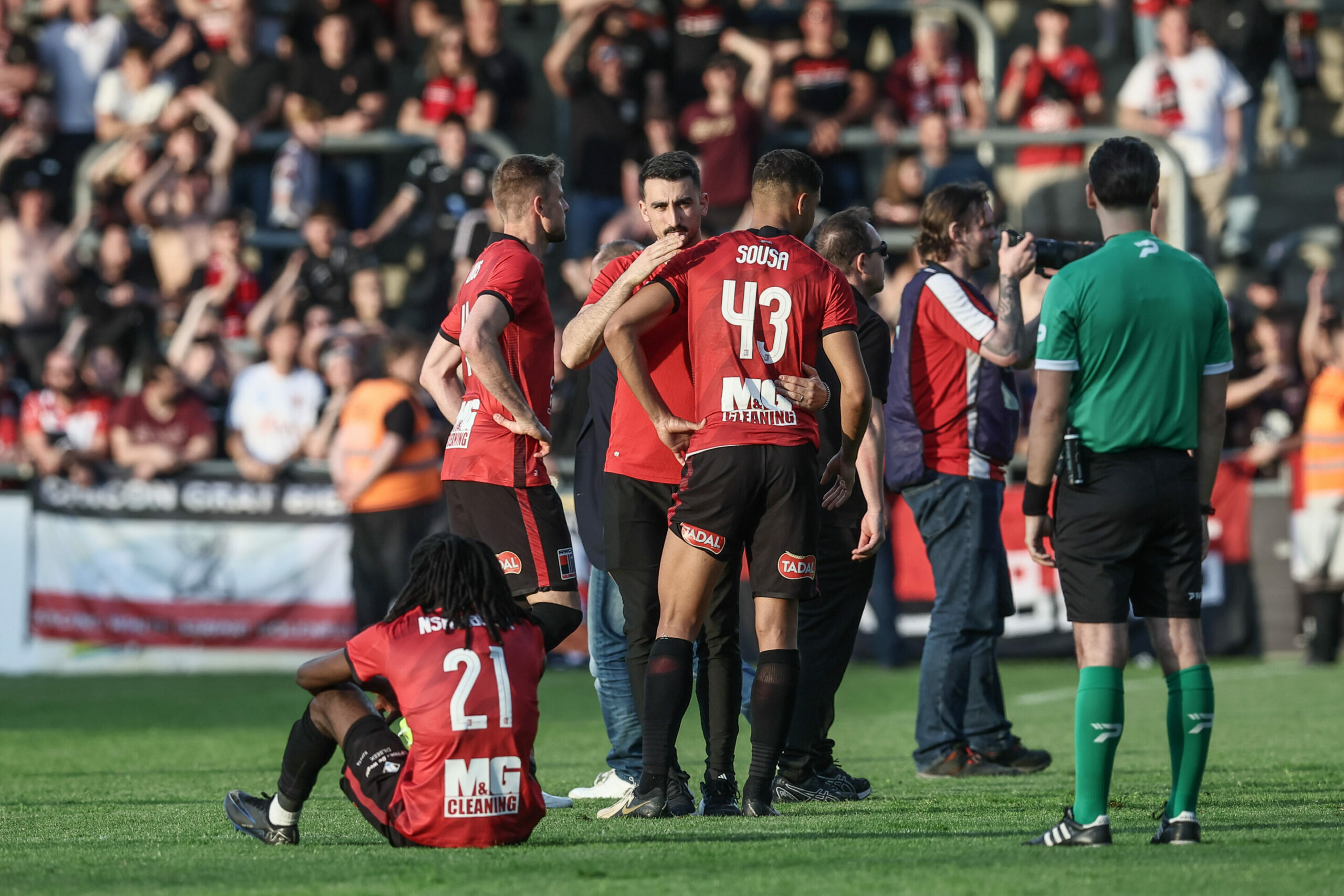 RWD Molenbeek's players look dejected after being relegated, Saturday 11 May 2024 in Eupen, on day 6 (out of 6) of the 2023-2024 'Jupiler Pro League - Relegation Play-offs. Credit: Belga / Bruno Fahy