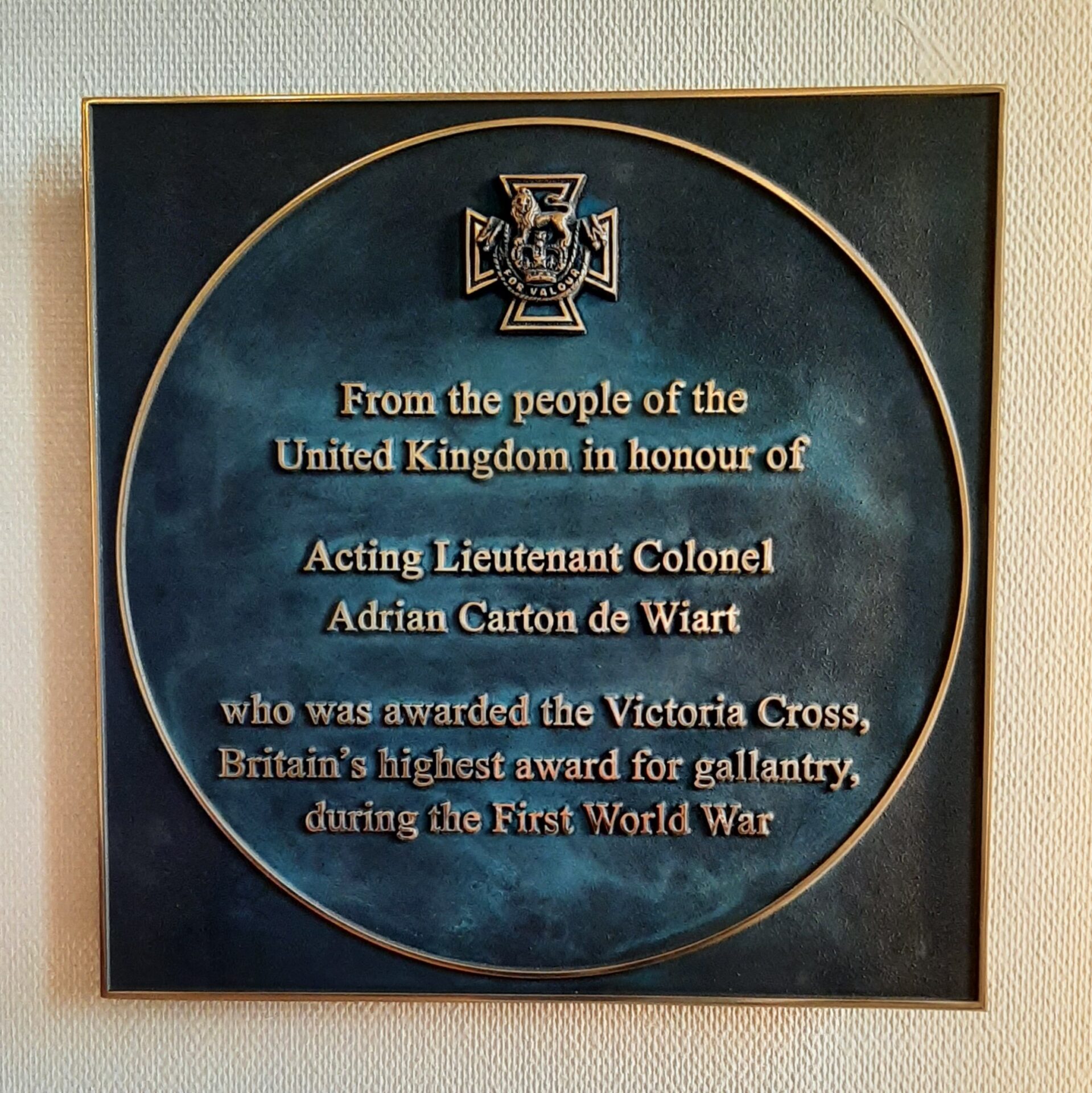 A bronze plaque recalling his award, one of 11 inscribed with the names of overseas Victoria Cross winners, was presented to Belgium in December 2014 to mark the centenary of the war. Incredibly, it has been kept since then in storage at the War Heritage Institute in Brussels.