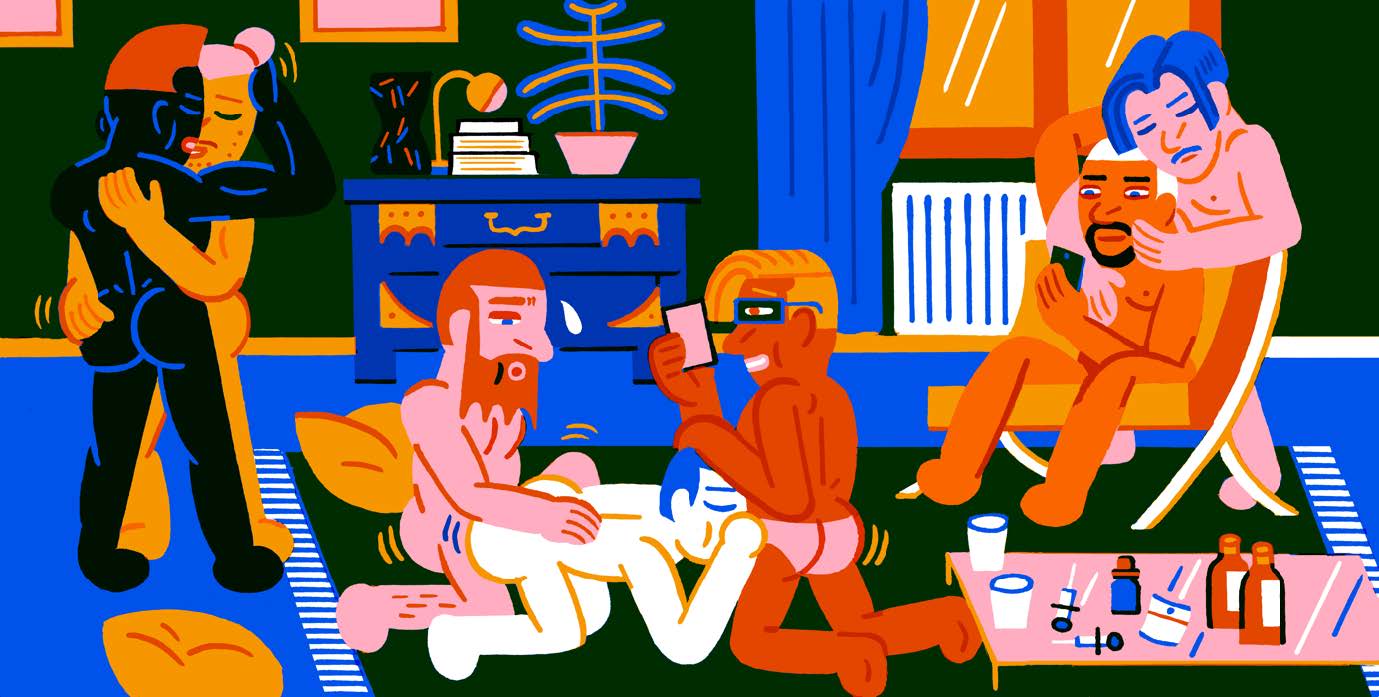 A drawing shows a group of men in a Chemsex session. Credit : Alias