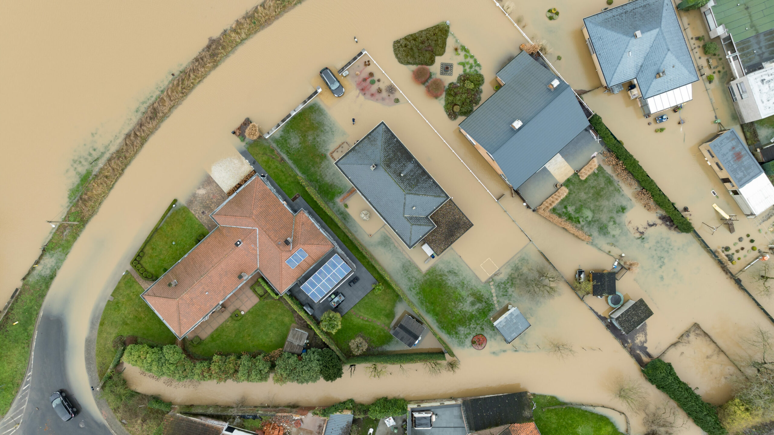 Aerial drone image shows floods after heavy rainfall in Zandbergen on Wednesday 03 January 2024. Credit: Belga/Kurt Desplenter