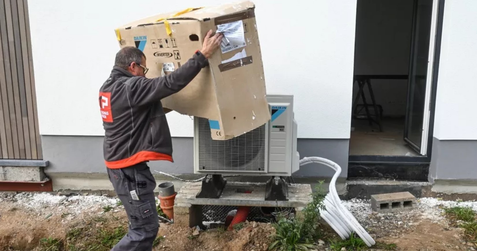 A demonstration heat pump at a fair booth under construction, at the yearly Batibouw construction fair, in Brussels. Credit: Belga/Dirk Waem