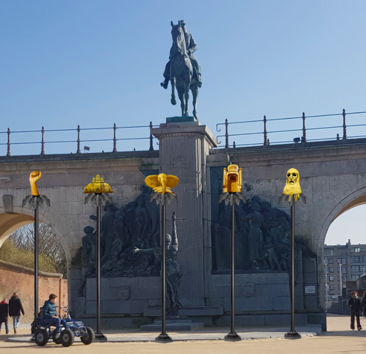 In 2019, Ostend decided to keep the monument in place but provide extra context though an artistic installation. Having been selected to work on the project, Locke planned to “interrupt the view” of the statue by placing five masts in front of it. On each mast, he intended to add a symbol of colonial history or resistance to colonial rule.