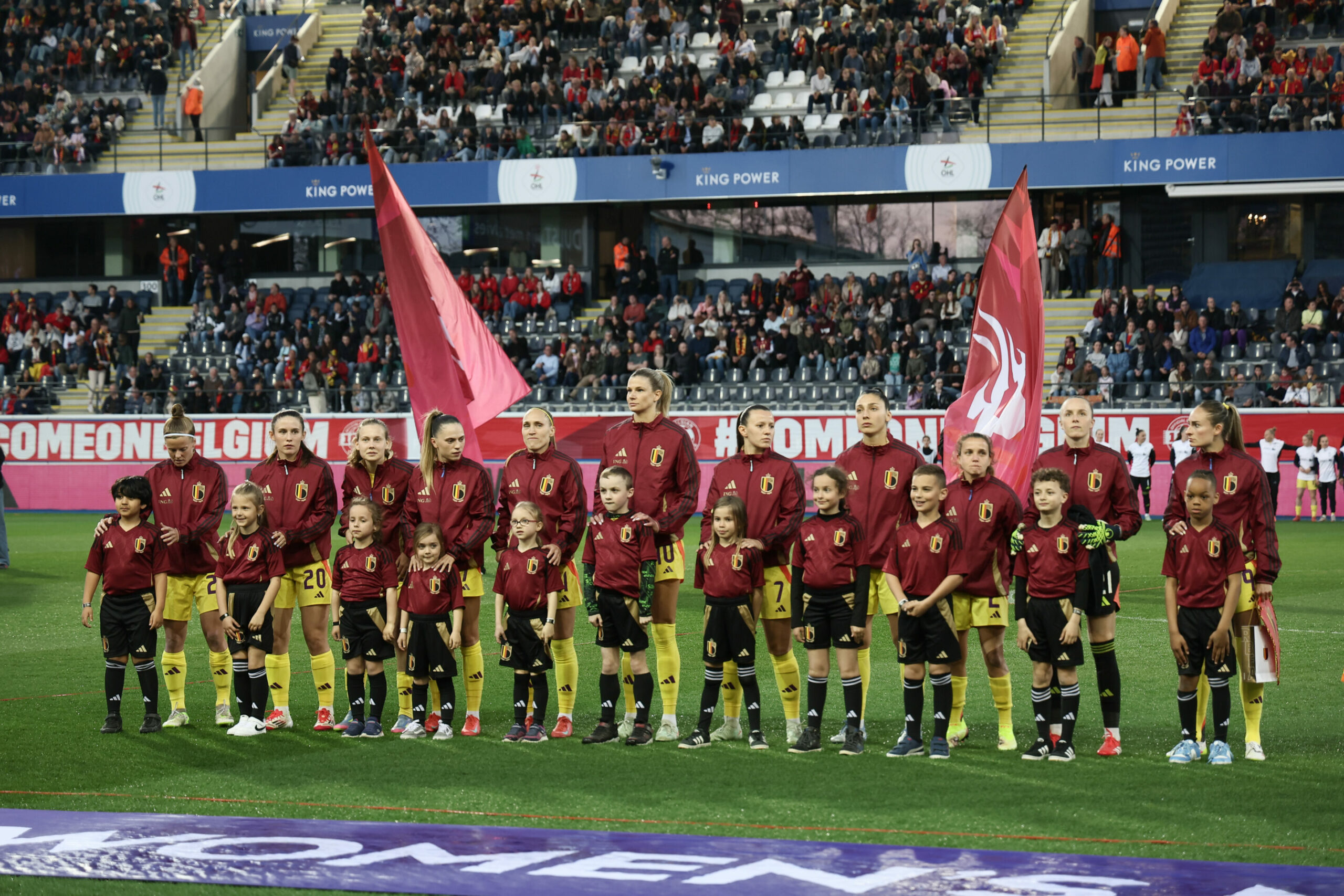 Belgium's players pictured at the start of a game between the national teams of Belgium (Red Flames) and England, during Women's Nations League competition, on Tuesday 08 April 2025 in Heverlee, Leuven. Credit: Belga / Bruno Fahy