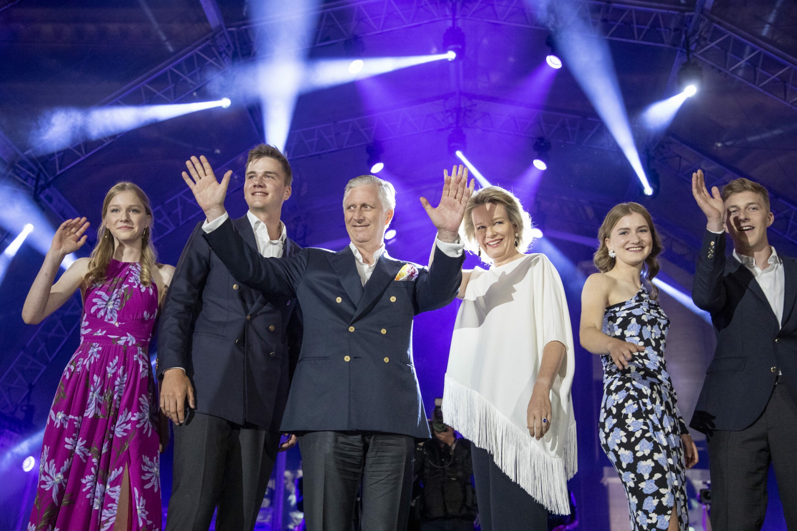 Princess Eleonore, Prince Gabriel, King Philippe, Queen Mathilde, Crown Princess Elisabeth and Prince Emmanuel pictured on the podium at the end of the 'Belgium Celebrates' event, at the Parc du Cinquantenaire in 2023. Credit: Belga/Nicolas Maeterlinck.