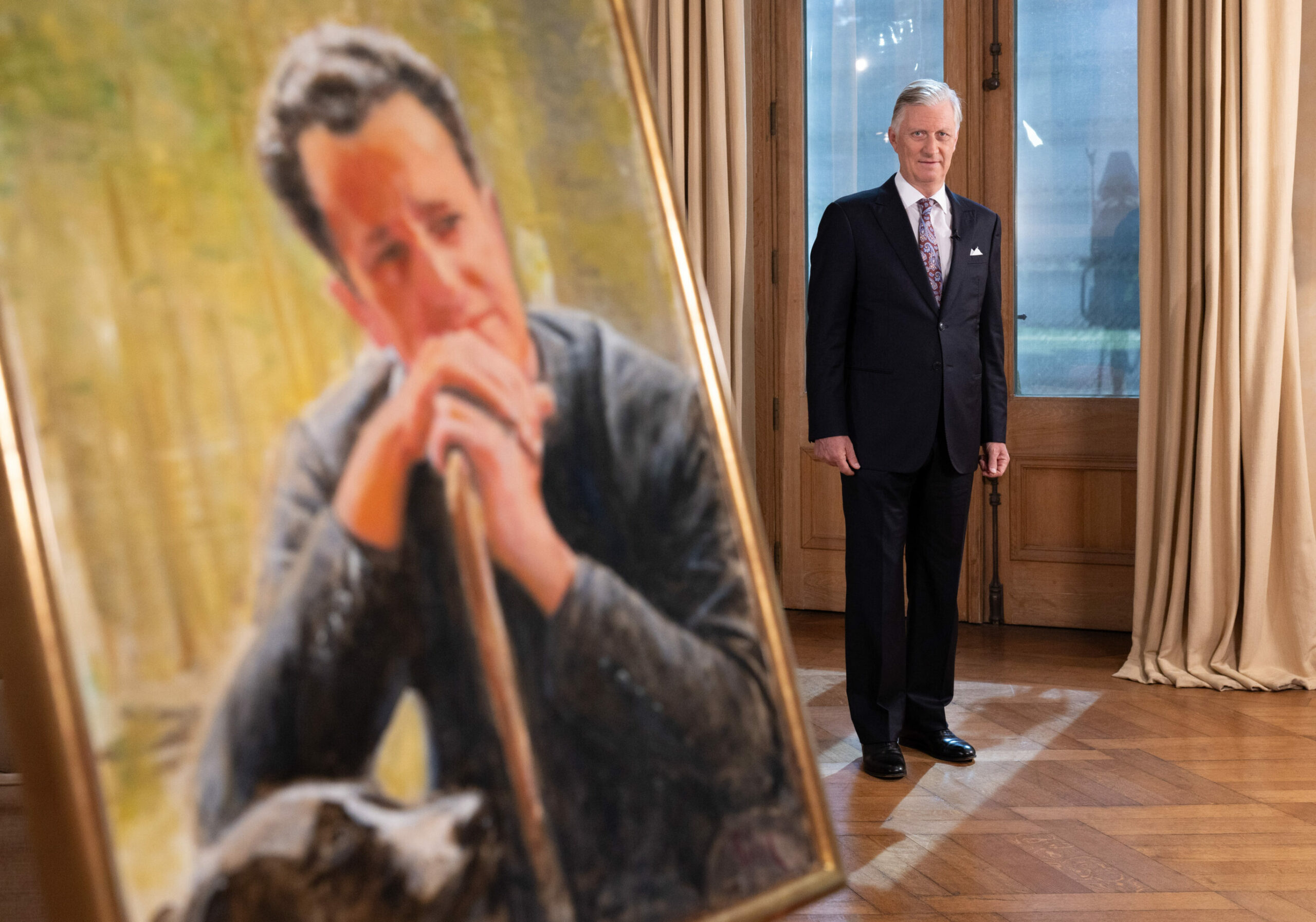 King Philippe with a portrait of former King Baudouin during the recording of his annual television and radio speech on the occasion of the Belgian National Day in 2023. Credit: Belga/ Benoit Doppagne.