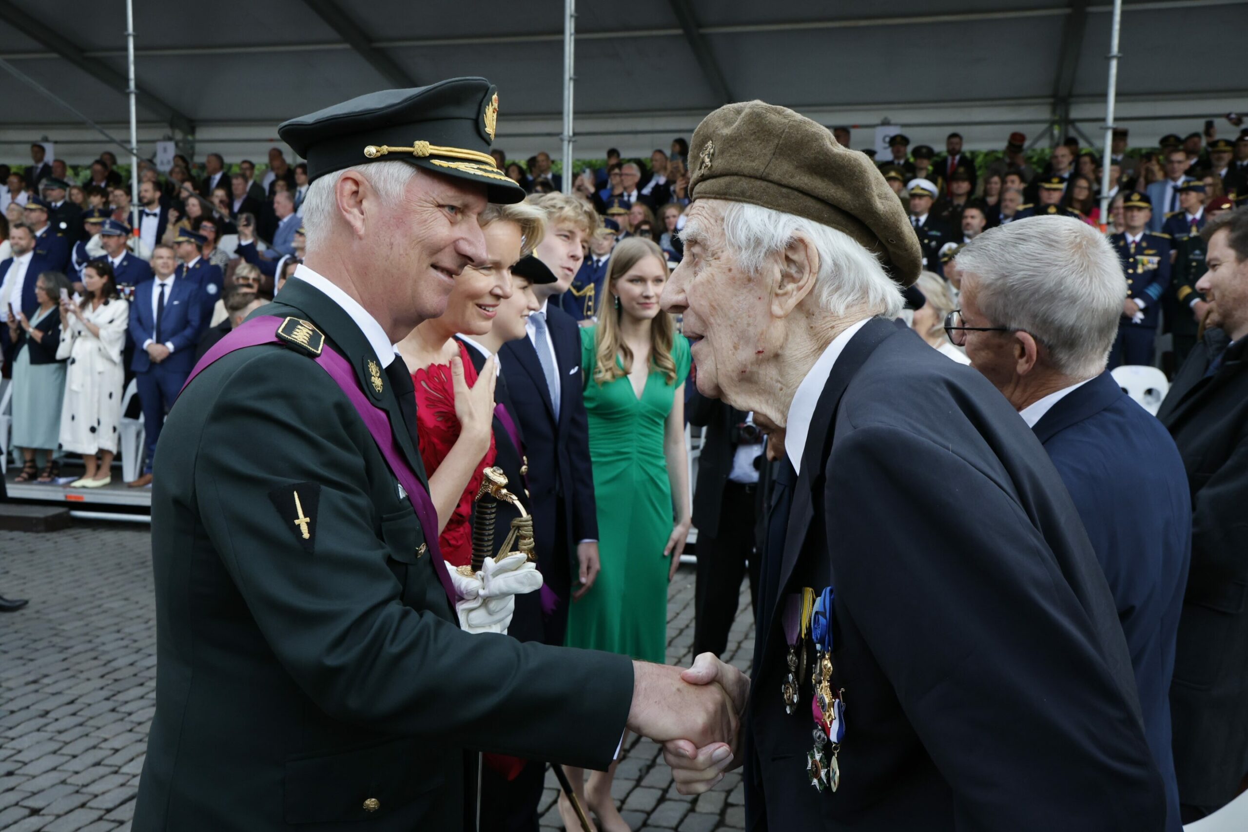 King Philippe of Belgium, Queen Mathilde of Belgium and shake hands with World War II veterans after the military and civilian parade on the Belgian National Day, in Brussels, Monday 21 July 2025. Credit: Belga / Nicolas Maeterlinck