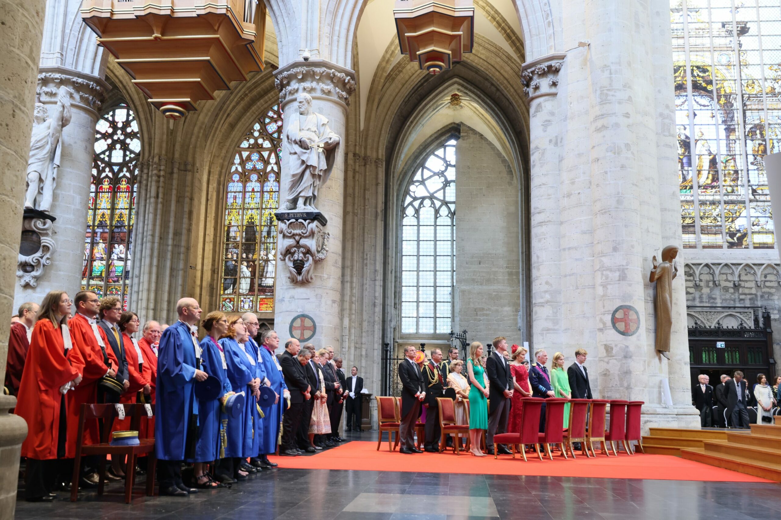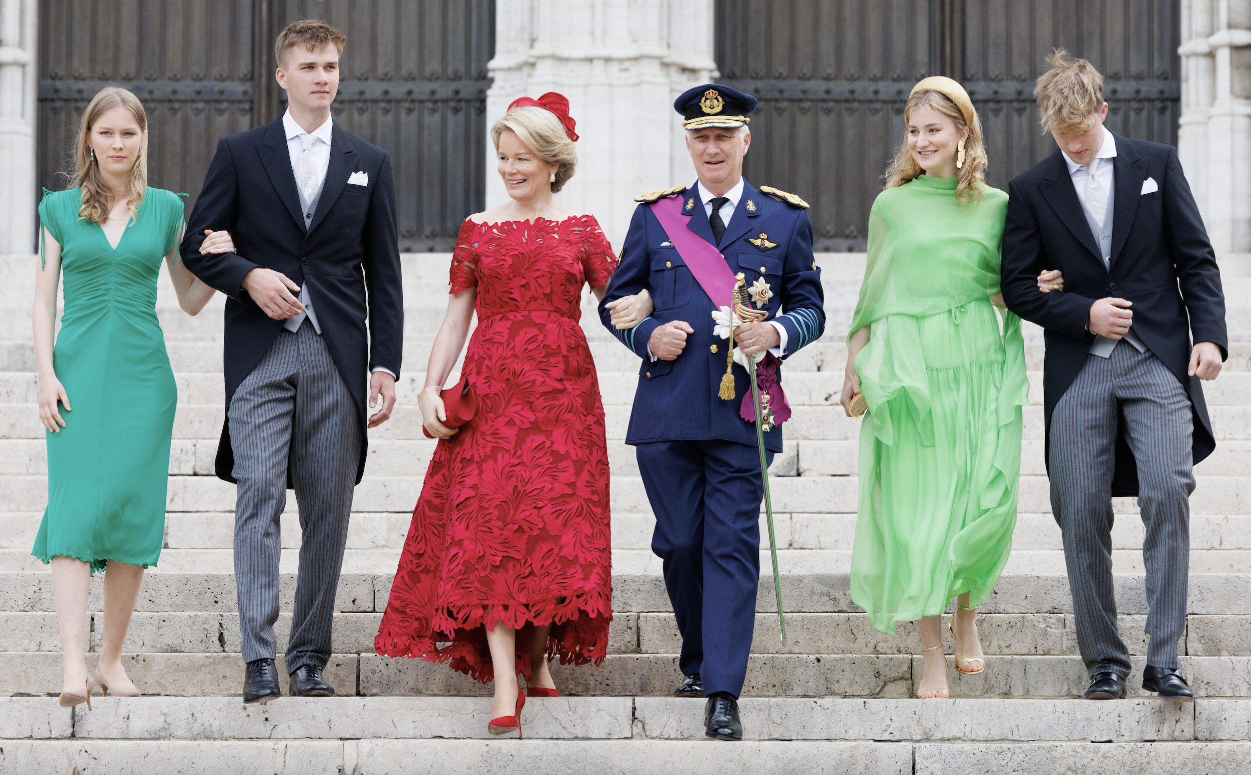 Princess Eleonore, Prince Gabriel, Queen Mathilde, King Philippe, Crown Princess Elisabeth and Prince Emmanuel of Belgium attend the Te Deum mass, on the occasion of the Belgian National Day, at the Saint Michael and Saint Gudula Cathedral in Brussels, Monday 21 July 2025. Credit: Belga / Benoit Doppange
