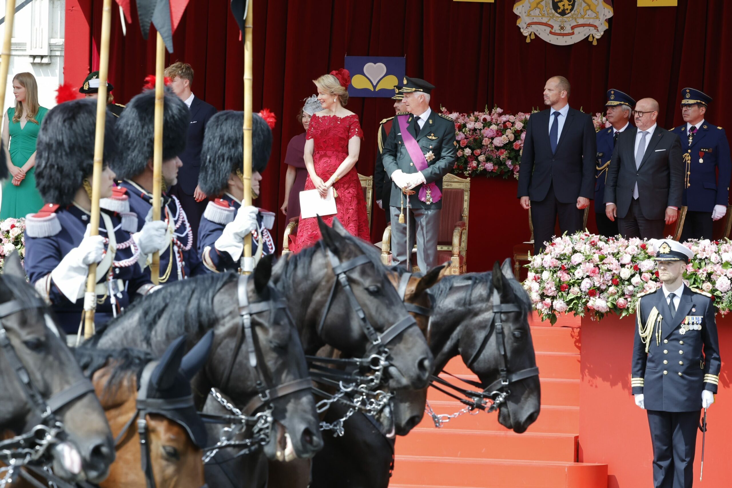 Queen Mathilde of Belgium, King Philippe - Filip of Belgium and Minister of Defence and Foreign Trade Theo Francken pictured during the military and civilian parade on the Belgian National Day, in Brussels, Monday 21 July 2025. Credit: Belga / Nicolas Maeterlinck