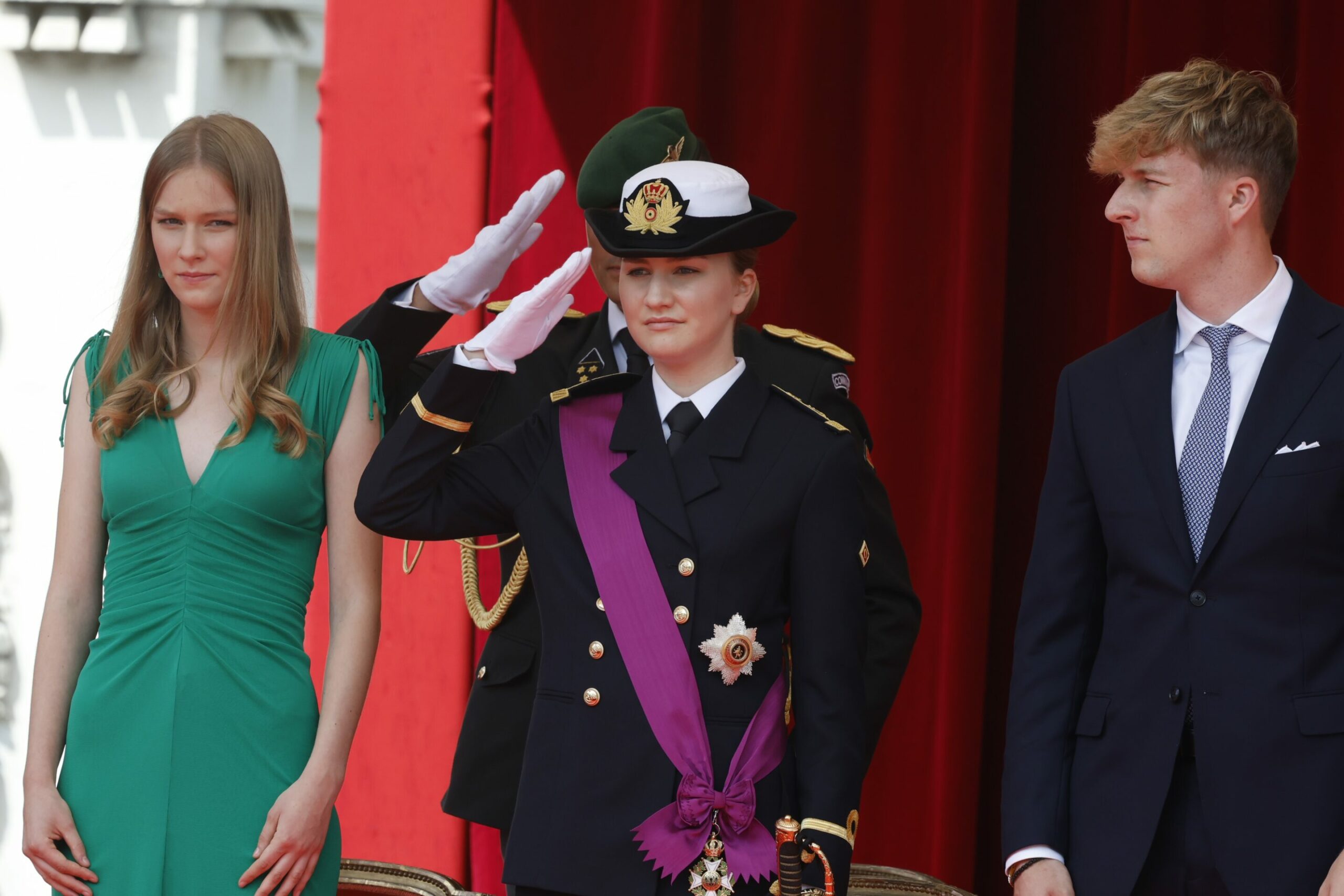 Princess Eleonore, Crown Princess Elisabeth and Prince Emmanuel pictured during the military and civilian parade on the Belgian National Day, in Brussels, Monday 21 July 2025. Credit: Belga / Nicolas Maeterlinck