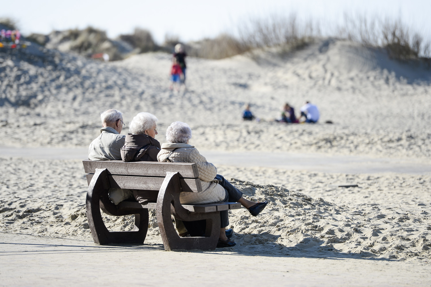 Elderly people sitting on a bench on the dike at the Belgian coast in Oostduinkerke. Credit: Belga/Laurie Dieffembacq