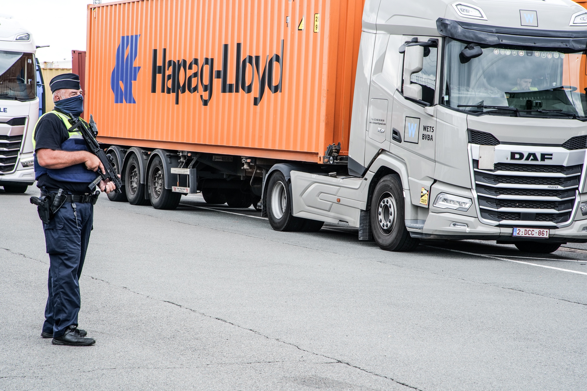 Picture shows a police officer next to a truck during, the presentation of the half-year figure for cocaine seizures in the first half of 2024 in the Port of Antwerp on Wednesday 10 July 2024, in Beveren.