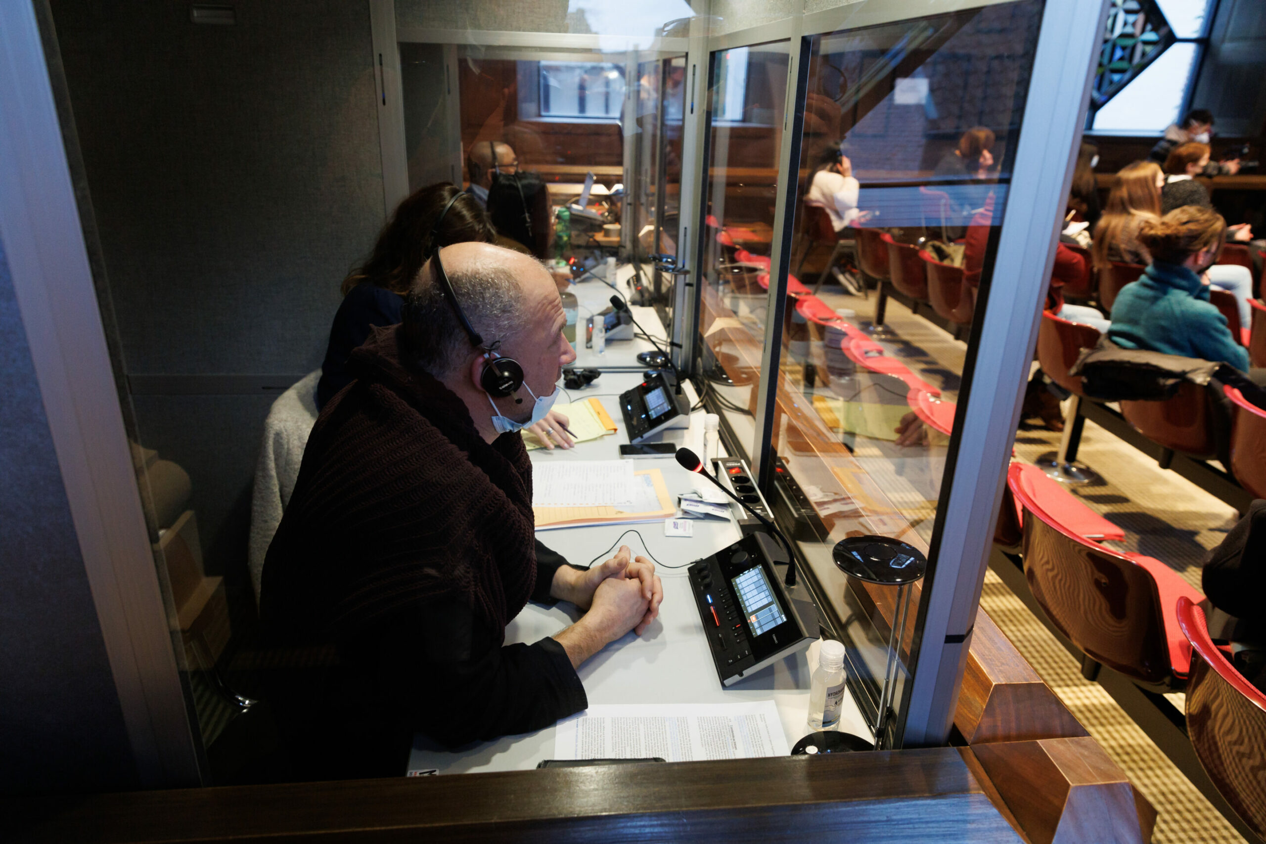 Interpreters pictured during a session in a court in Brugge. Credit: Belga / Kurt Desplenter
