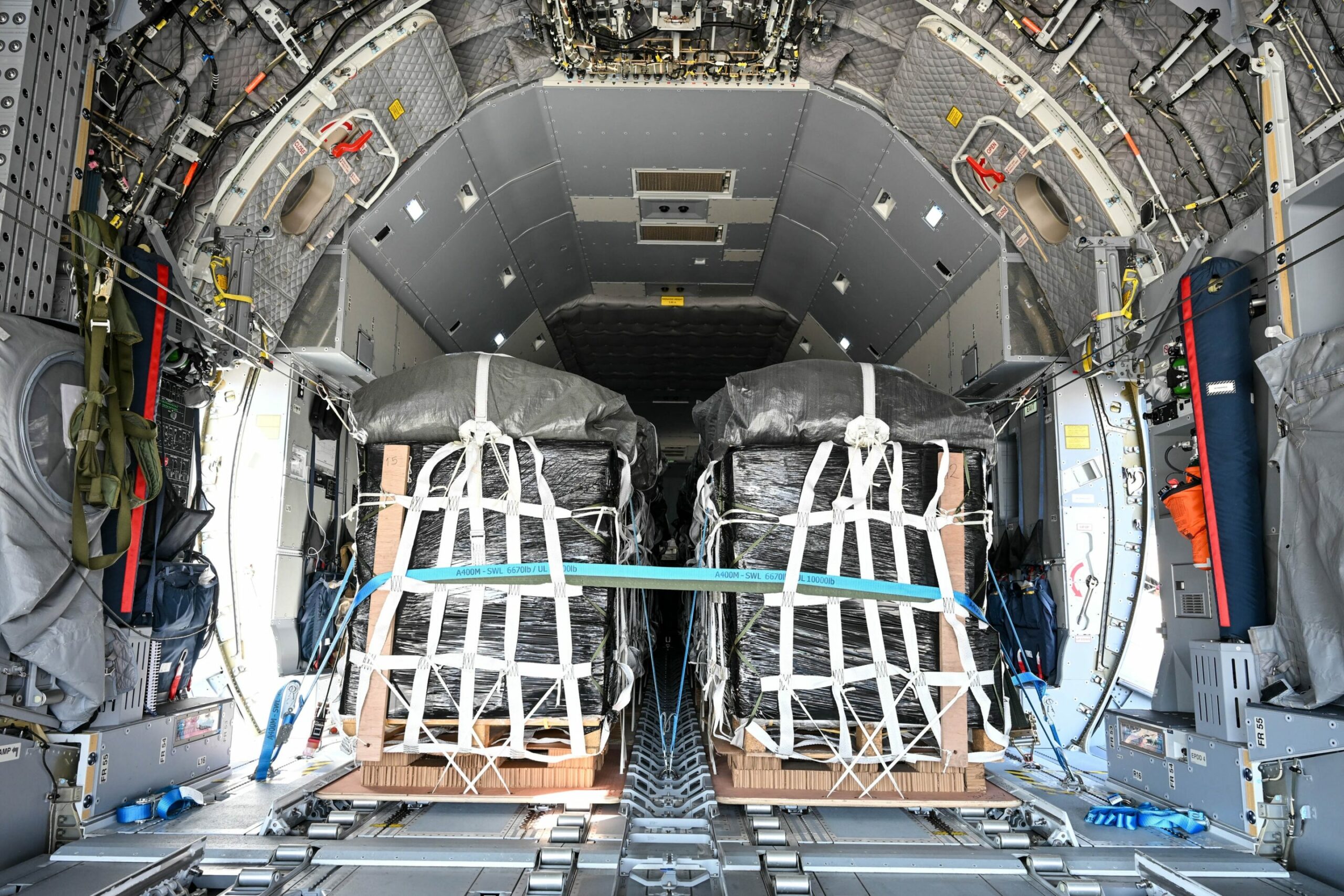 Humanitarian aid loeded in a Belgian Defense A400M transport aircraft. Credit: Belgian Defence/Belga