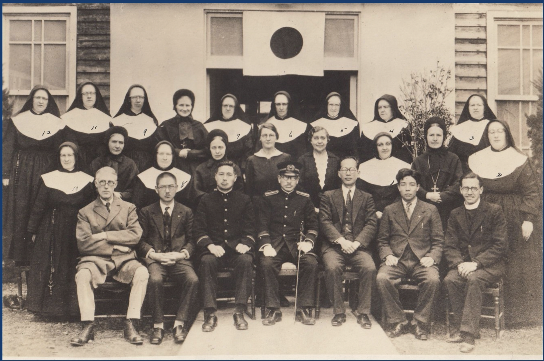 Staged photograph of Japanese internment camp: Father Goossens is front row, far right. Alongside him are Sisters of Notre Dame de Namur, other lay sisters, Protestant missionaries, an English doctor, and Japanese police officials who ran the camp.