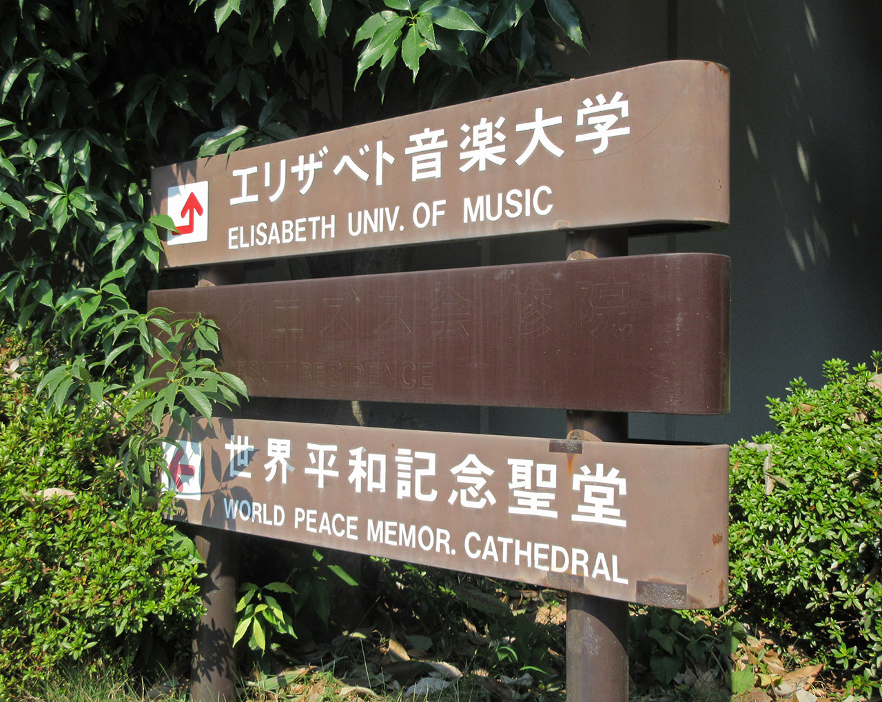 Sign for the Elisabeth University of Music and the World Peace Memorial Cathedral. Credit: Jesuits Global