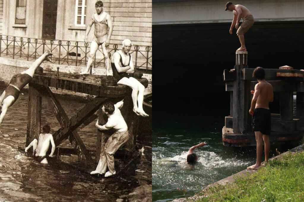Collage comparing Belgian canal swimmers in 1935 and 2025. Credit: Pool is Cool / Kosmos Khoroshavin / The Brussels Times