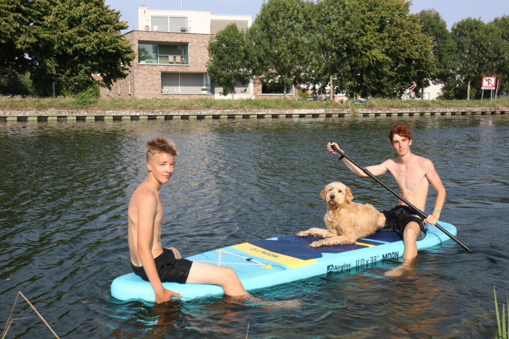 Two boys paddle boarding with the dog of Ken Van Halle, local who borrowed it to them. Kayaking, paddle boarding and similar activities which don't involve swimming are allowed in Vaartdijk. Fishing is allowed as well, but a license is needed. Credit: Kosmos Khoroshavin / The Brussels Times